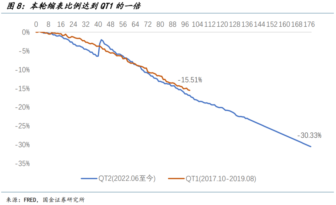 联储从2022年6月开始的缩表进程虽遭遇硅谷银行危机等扰动,但迄今为止的177周时间内仍成功缩减了30.3%的资产负债表规模,相较于上一轮周期99周时间内削减15.5%的资产负债表规模接近翻番。但当前转向自然扩表仍不具备明显的必要性,未来再度QE可能需要具体流动性风险事件催化。