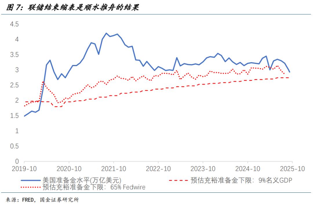 隔夜逆回购用量接近归零,储备金水平也接近不同方法所估计的充裕水平下限范围附近,回购市场利率频繁跳升以及流动性工具使用频率的增加都指向了一个逐渐收紧的美元流动性环境,结束缩表的必要性正在增加。