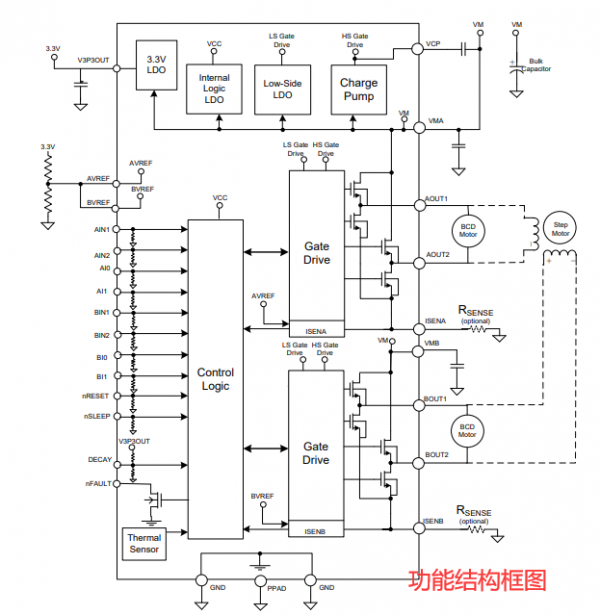 AIN1/AIN2、BIN1/BIN2:控制 H 桥输出状态