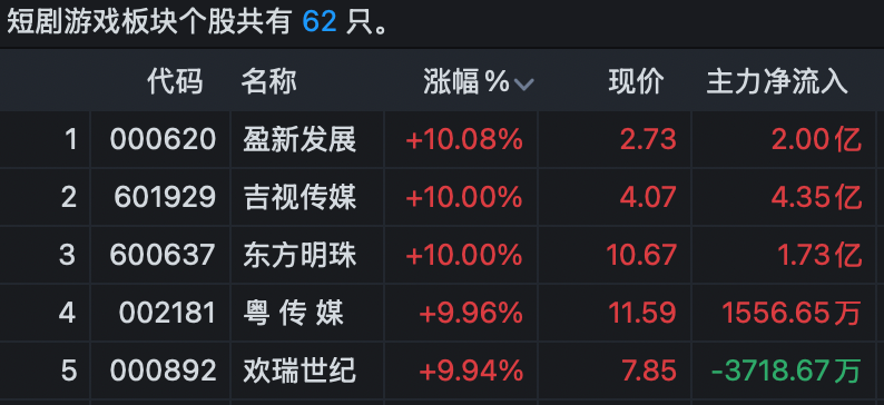 盘初,短剧概念股拉升。盈新发展、吉视传媒、东方明珠、粤传媒、欢瑞世纪等多股涨停。