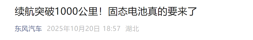 无独有偶,就在一周前,东风汽车官方微信公众号发文称,东风汽车已经成功量产固态电池并构建起供应链,预计于2026年实现装车。