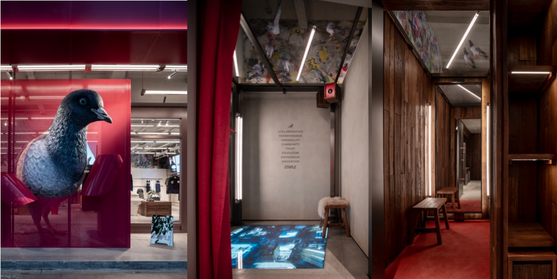 此次上海品牌旗舰店以“城市观察者”为概念,巧妙地将纽约城市工地的工业脚手架元素与上海老城区的文化肌理相融合,打造与本土消费者建立深刻链接的零售空间。店铺设计中还引入了“鸽子”主题装置与“鸽子屋”空间,赋予消费者“鸟类视角”,引导其沉浸式体验东西方街头文化的深度碰撞。
