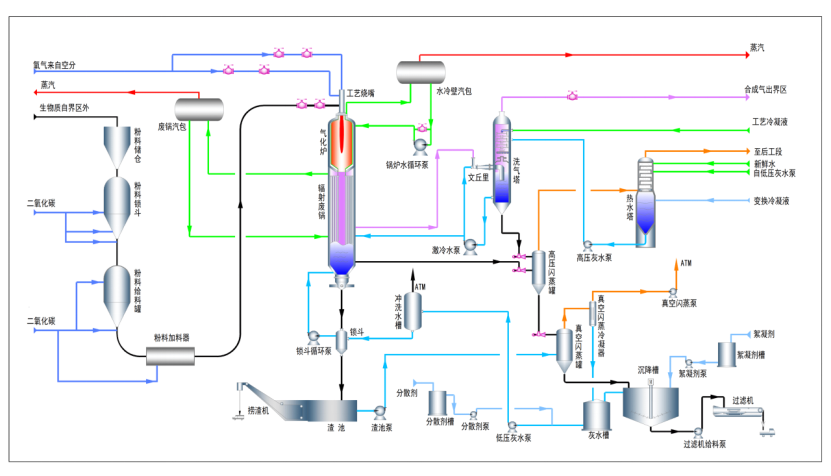 气流床气化炉:反应温度高,适用于粉状生物质。可获得低焦油、高纯度合成气,碳转化率高,适合大型绿色甲醇项目。