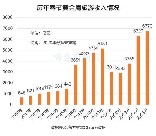 从文化和旅游部披露的数据来看,从2024年开始我国春节黄金周旅游收入明显复苏,当年旅游收入达6327亿元,同比增长68.36%,较2019年的5139亿元亦增长23.12%。2025年春节旅游收入再创新高,达6770亿元。