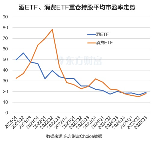 拿中证消费ETF(最新规模约210亿元,同类遥遥领先)和鹏华酒ETF(规模最大的酒ETF)来说,2025年三季报重仓持股的平均市盈率分别为18.23倍和19.3倍,处于最近几年的较低水平。