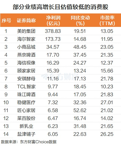 比如美的集团,前三季度业绩增长19.51%,最新估值只有13.05倍。海尔智家前三季度业绩增长14.68%,最新估值为11.95倍。小商品城、燕京啤酒、顾家家居、新乳业等个股,同样在前三季度业绩两位数增长且最新市盈率在20倍左右。