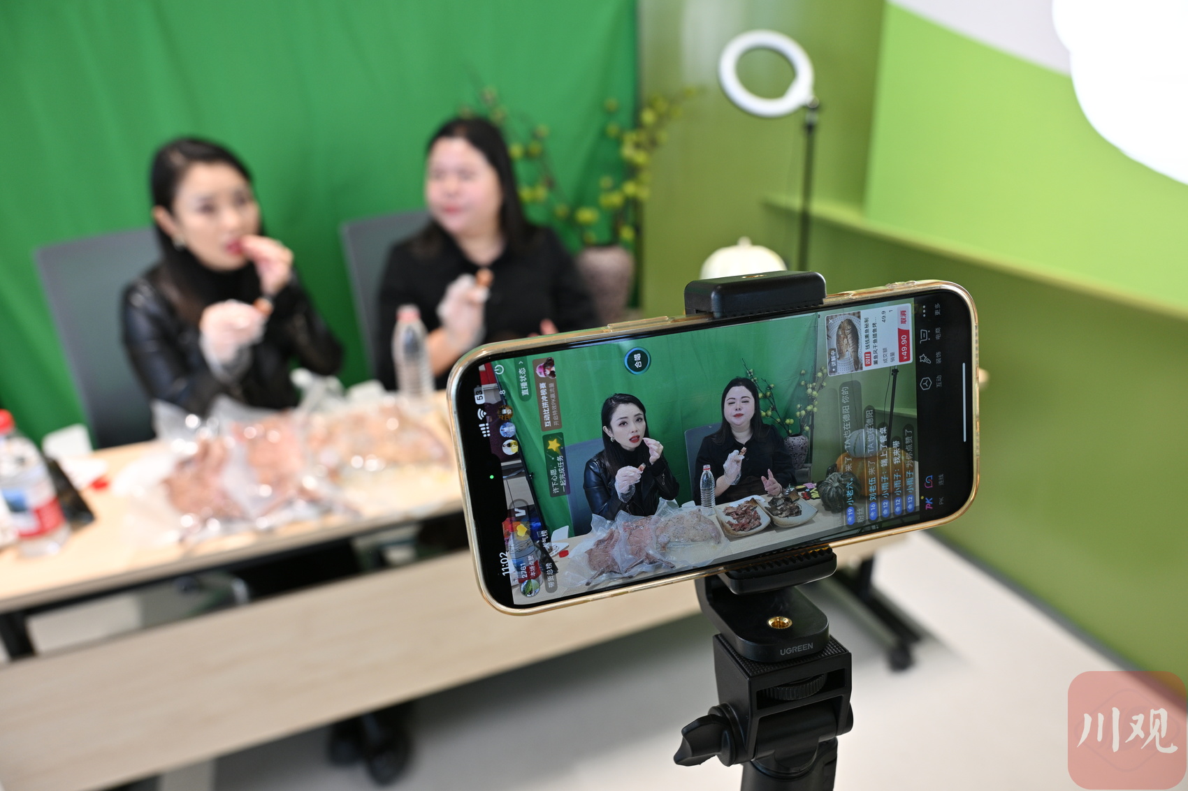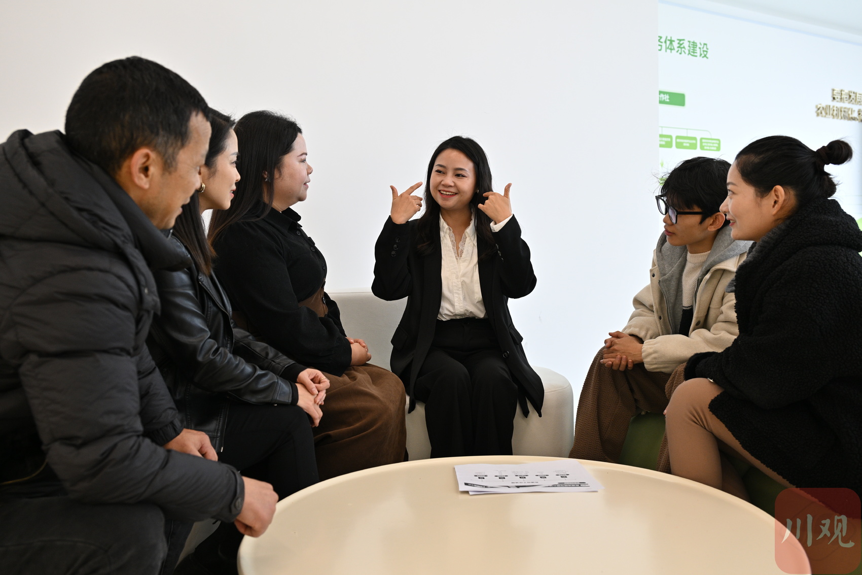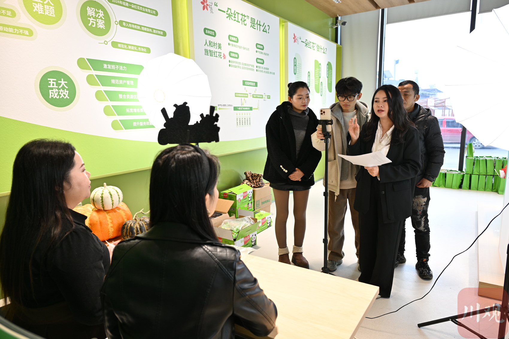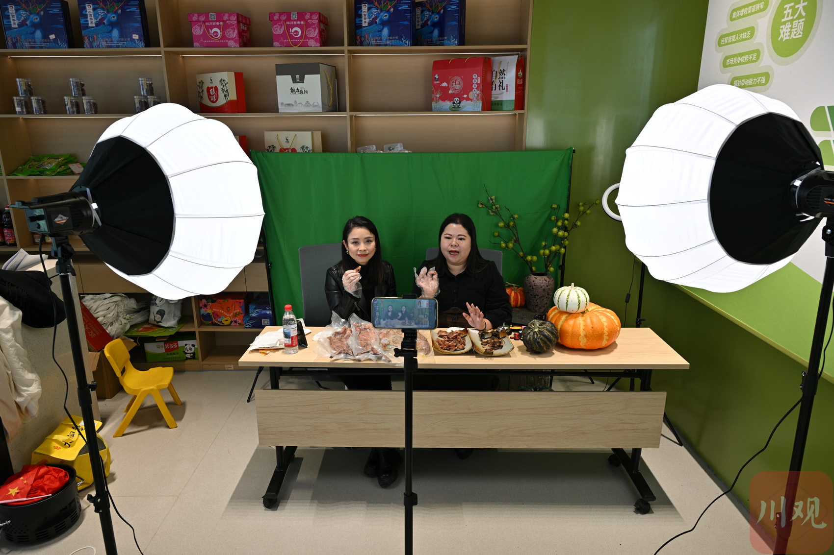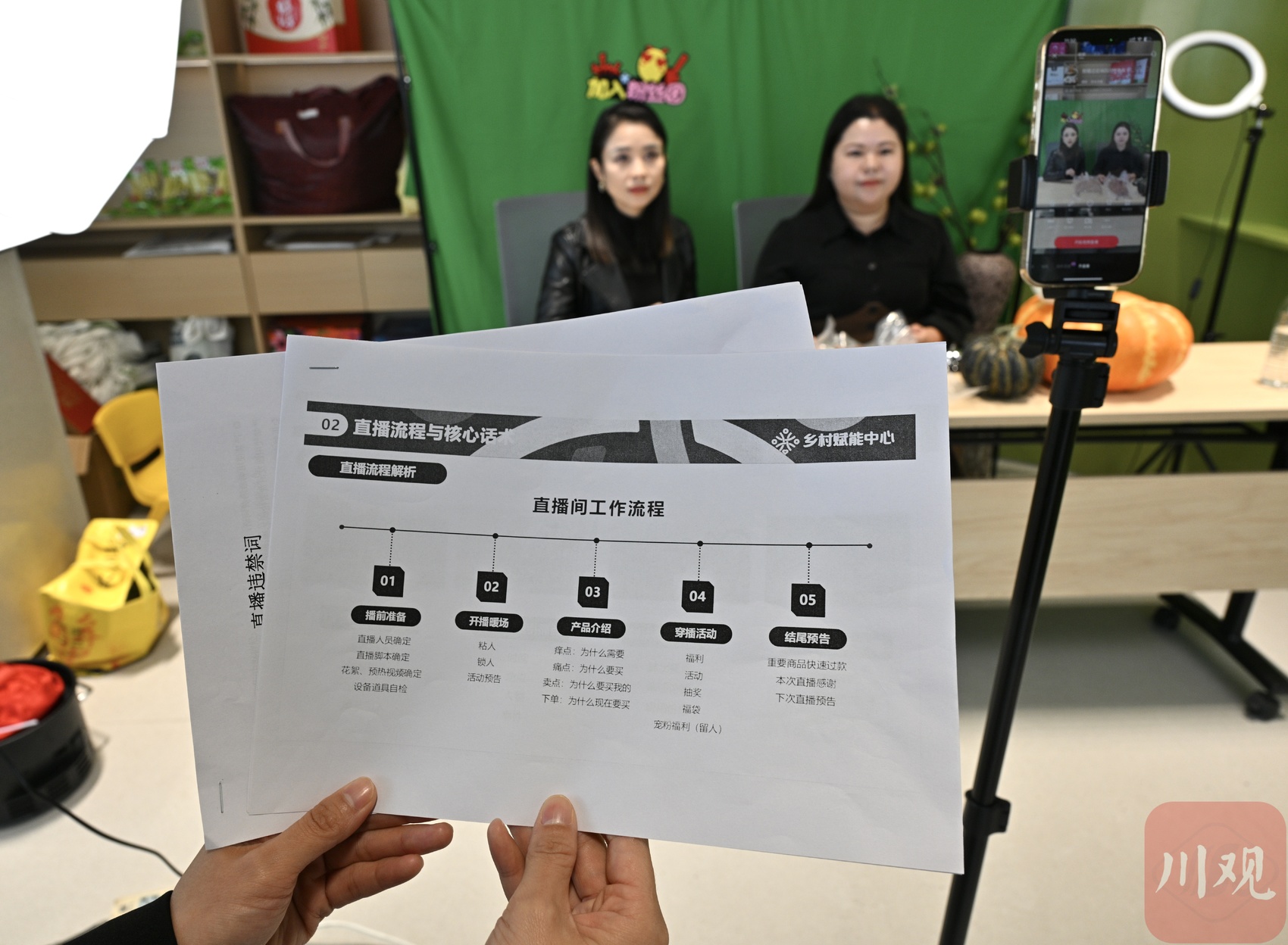 11月5日,位于德阳市旌阳区柏隆镇红花村党群服务中心内的“村播中心”,乡村运营师文敏指导着村里的“新农人”学习直播带货。