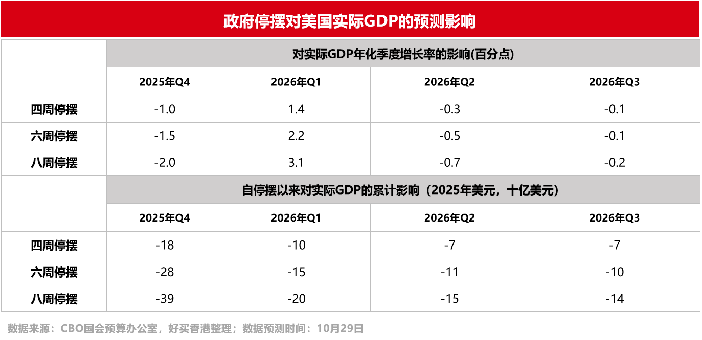 随着“停摆”时间拉长,除了会影响到民生领域(食品救济、医保福利、民航交通等),对美国的宏观经济也会造成一定影响。据美国国会预算办公室(CBO)报告显示,预计今年四季度美国实际GDP的年增长率将下降一至两个百分点。
