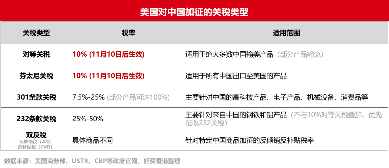 美国对中国加征的关税包括:对等关税、芬太尼关税、301条款关税、232条款关税、反倾销和反补贴税。其中“对等关税”和“芬太尼关税”的税率将在11月10日后降至10%。目前,中国是被加征对等关税税率最低的国家之一。