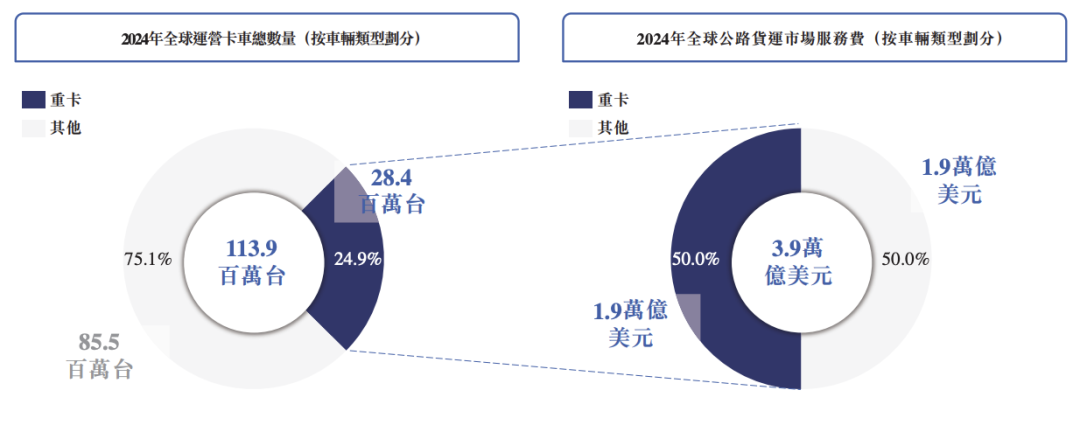 上市申请书提到,根据灼识谘询的资料,全球公路货运市场规模庞大,2024年已达3.9万亿美元,但该行业长期受三大痛点制约:高碳排放、高总拥有成本和安全风险。