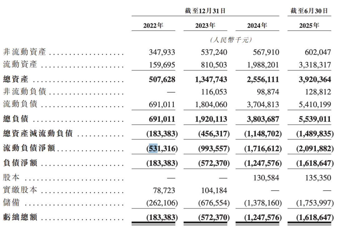 2022年、2023年、2024年及2025年上半年,其总资产分别为5.08亿元、13.48亿元、25.56亿元和39.2亿元,而同期公司的总负债分别为6.91亿元、19.2亿元、38.04亿元和55.39亿元。