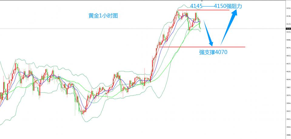但4150附近承压之后,将上涨的时间会拖后,周一大涨之后,很多人以为单日100美金以上的行情又来了,现在毕竟是总体高位大区间震荡,不可能每天都涨100美金。但总体的日线级别上涨趋势没变,短线修正之后,还会启动第二波上涨,但有一种情况需要注意,这一波本身是自4380下跌之后的反弹修正,一旦消耗的时间过长,上不去,就要注意力度减弱后上不去,再跌。所以一旦消耗到下周还不能突破4150——4160的压力,多头就要小心。