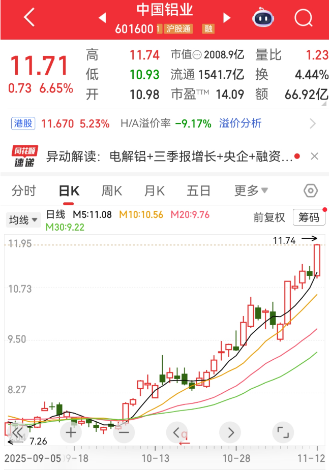 一方面,建筑材料、化工、机械制造等周期板块龙头股纷纷走强,中国铝业、冀凯股份、耀皮玻璃等大涨。中国铝业涨超6%,股价创历史新高,最新市值约2008亿元。