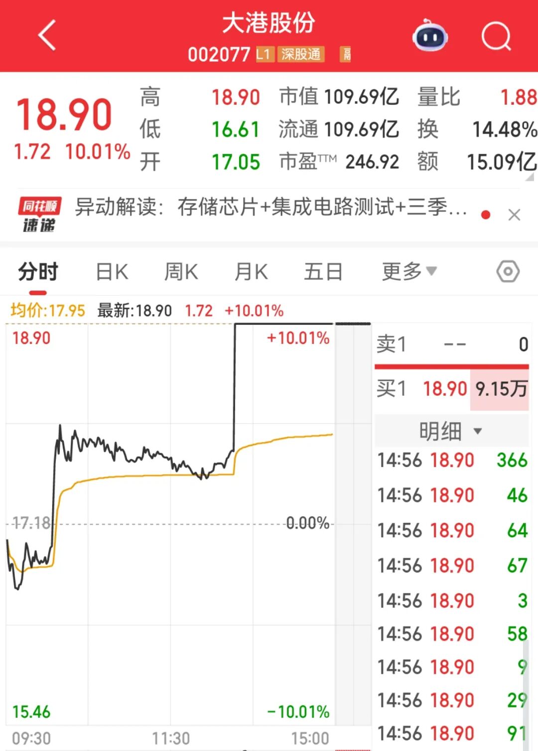 存储芯片板块午后异动,大港股份1分钟直线涨停,截至收盘封单数量超9万手;香农芯创、德明利均上涨。