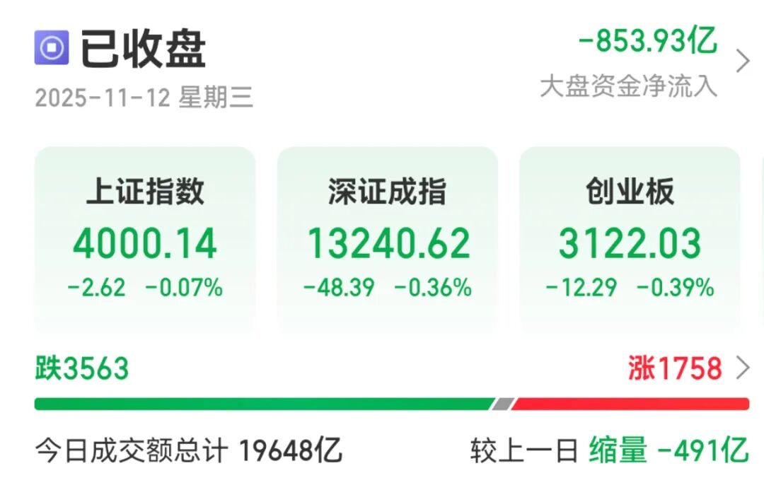 截至收盘,上证指数跌0.07%,深证成指跌0.36%,创业板指跌0.39%。