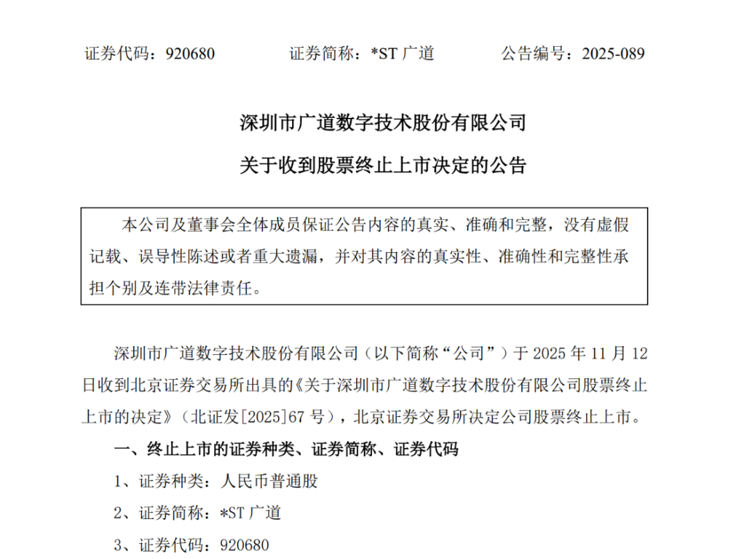 北交所上市公司*ST广道(证券代码:920680)11月12日晚间发布公告称,当日收到《关于深圳市广道数字技术股份有限公司股票终止上市的决定》,北交所决定公司股票终止上市。