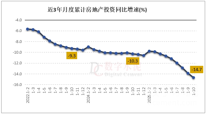 全国固定资产投资同比降幅扩大,基础设施投资同比增速由正转负,投资不足现象显现。铁路运输业与水利管理业投资同比增速较1-9月进一步回落,其中水利管理业增长乏力,道路运输业投资降幅则继续小幅扩大。国家发展改革委近期新增2000亿元专项债券额度,专门用于支持部分省份投资建设,有望提振水泥需求。房地产行业仍处于深度调整阶段,投资信心偏弱,房地产开发规模持续收缩。全国房地产开发投资、房屋新开工面积及企业到位资金同比降幅持续扩大,房屋施工面积降幅则与前期持平,地产端水泥需求继续承压。