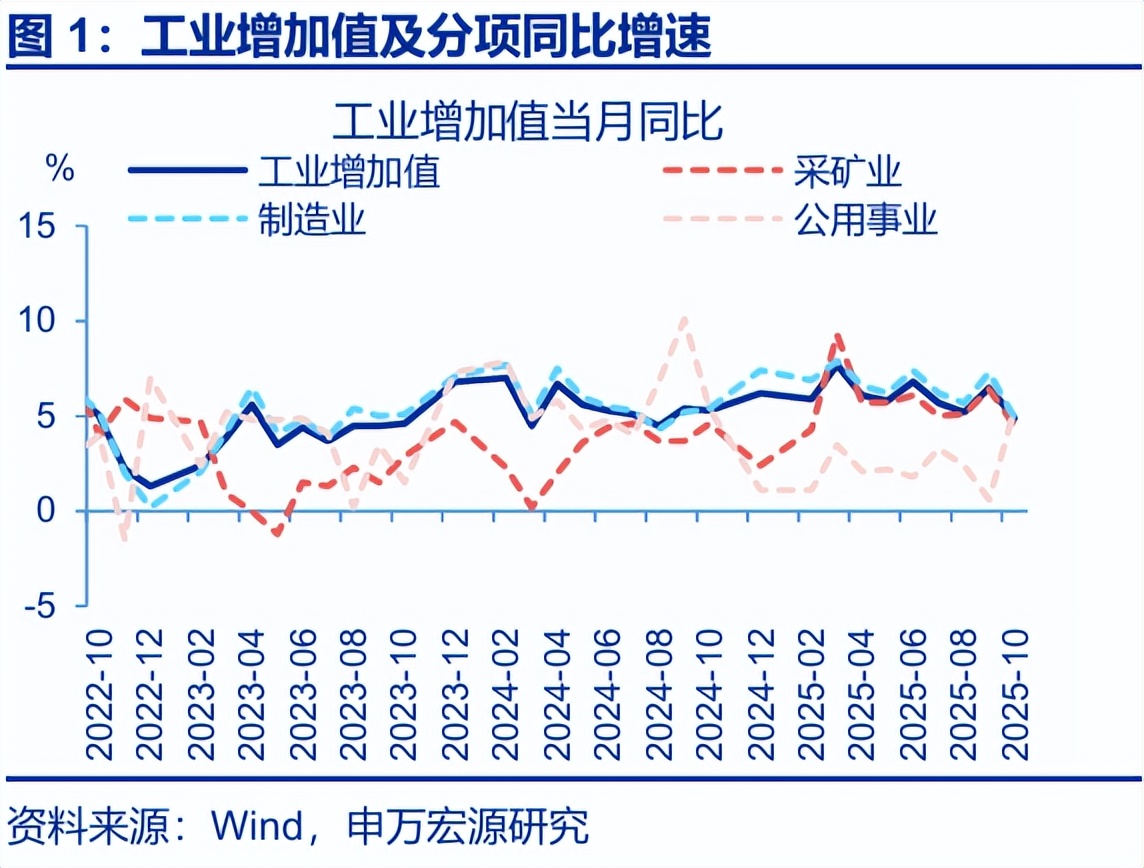 生产:工业生产走弱,服务业生产有所回落。10月,工业增加值当月同比较9月下行1.6pct至4.9%。其中制造业生产增速降幅较大,当月同比边际回落2.4pct至4.9%,采矿业(-1.9pct至4.5%)有所回落,公用事业大幅回升(+4.8pct至5.4%)。此外,服务业生产有所回落,10月服务业生产指数当月同比下行1.0pct至4.6%。