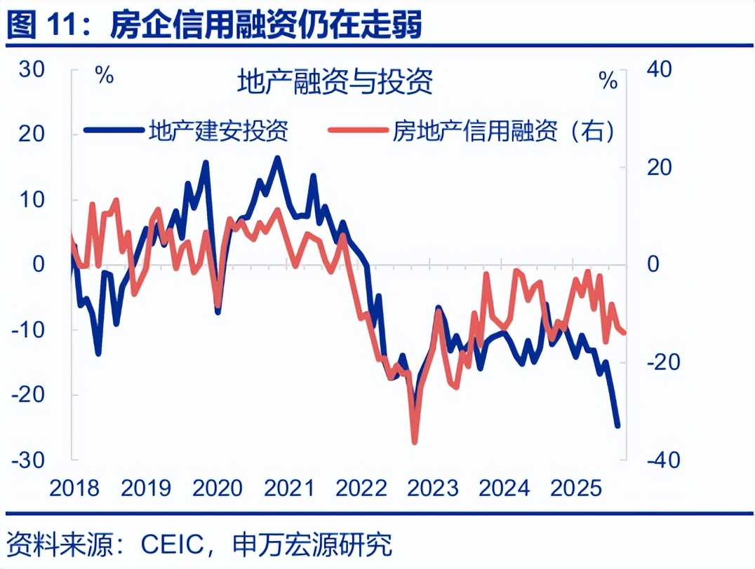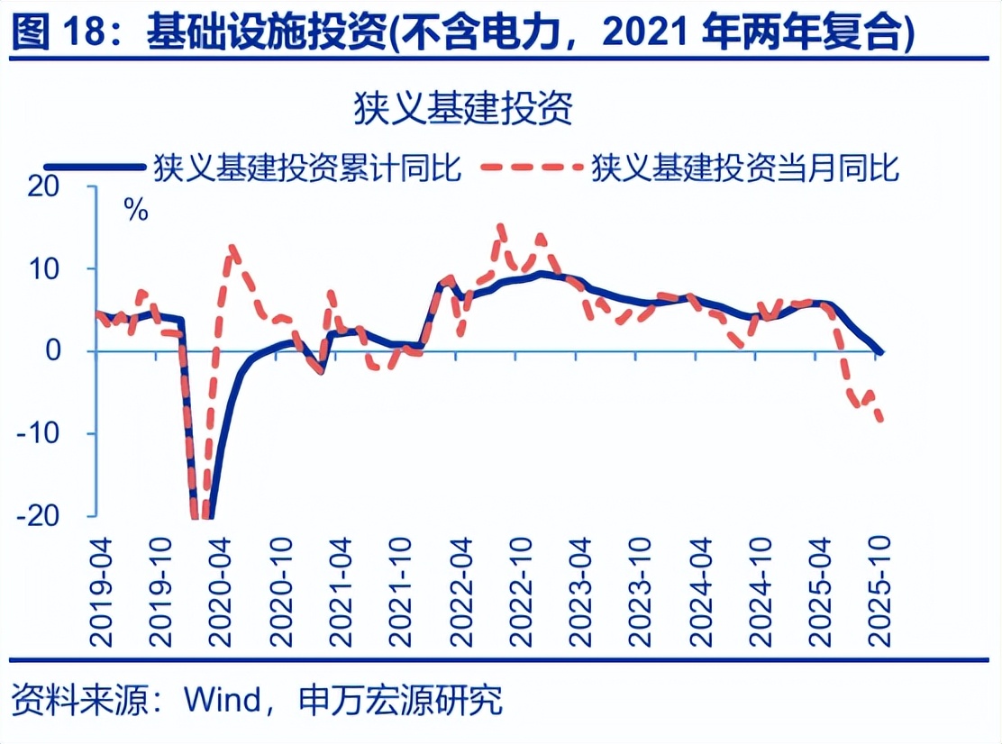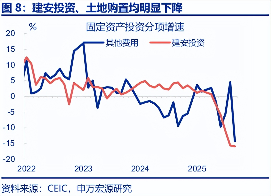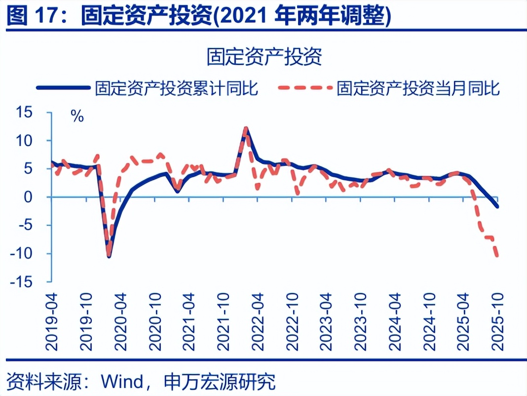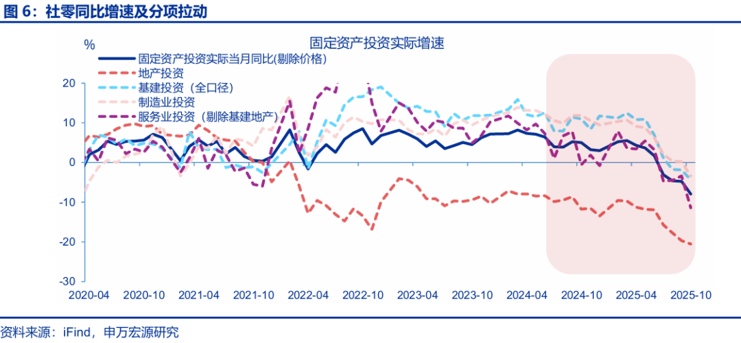 投资:土地购置费扰动与企业清账拖累投资大幅下滑;化债对投资的“挤出效应”已在边际缓解,建安投资增速未再明显回落。10月固定投资当月同比回落3.6pct至-10.7%,剔除价格后实际增速回落-3.4pct至-7.9%;从投资类型看,受土地购置费影响的其他费用增速在9月大幅冲高后、10月回落18.8pct至-14.3%,是导致投资下滑的主要原因;相比之下,前期持续走弱的建安投资增速,与9月增速基本接近(-16%左右),未再进一步大幅下滑。10月新增专项债中特殊再融资债占比也大幅下滑至20%以下,或显示化债对投资的“挤出效应”已在边际缓解;从行业类型看,地产投资(-1.6pct至-22.9%)、广义基建(-2.8pct至-7.4%)回落幅度相对较小,而制造业投资(-3.7pct至-6%)、服务业投资(-8.3pct至-13.4%)回落较大,或显示企业清账对投资的影响仍在持续,反内卷与设备更新自然周期退坡也构成额外拖累。