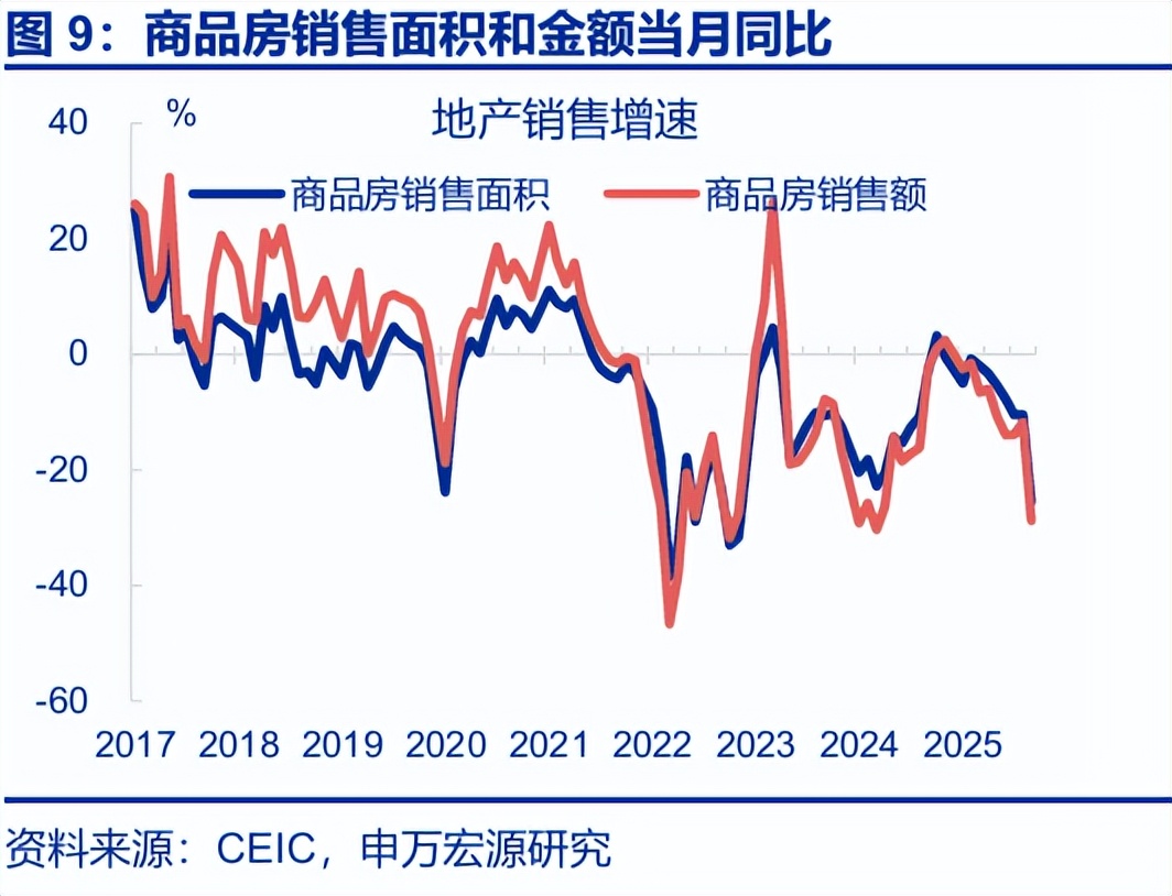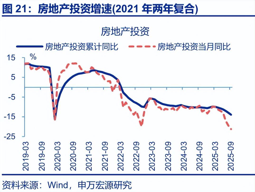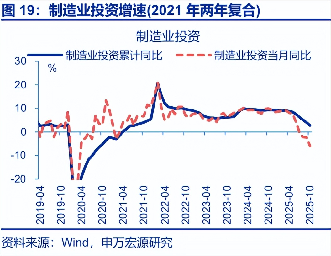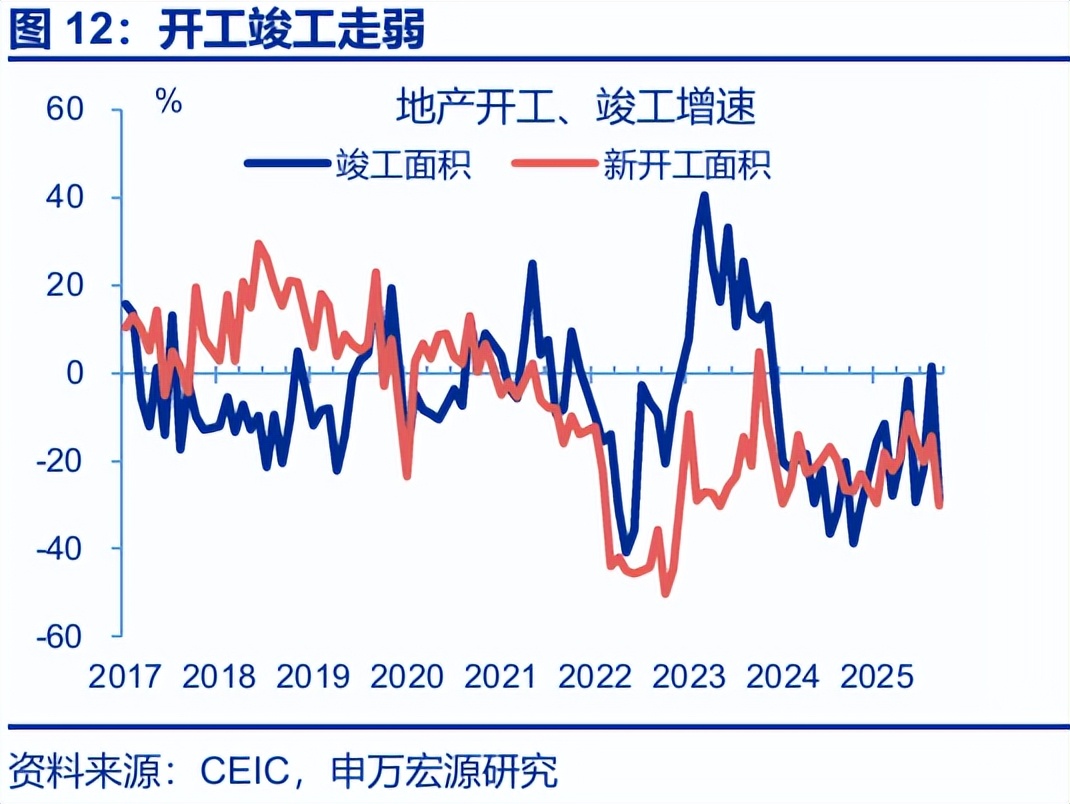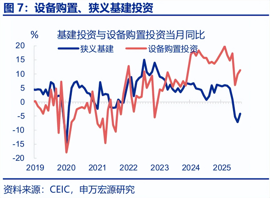 投资:土地购置费扰动与企业清账拖累投资大幅下滑;化债对投资的“挤出效应”已在边际缓解,建安投资增速未再明显回落。10月固定投资当月同比回落3.6pct至-10.7%,剔除价格后实际增速回落-3.4pct至-7.9%;从投资类型看,受土地购置费影响的其他费用增速在9月大幅冲高后、10月回落18.8pct至-14.3%,是导致投资下滑的主要原因;相比之下,前期持续走弱的建安投资增速,与9月增速基本接近(-16%左右),未再进一步大幅下滑。10月新增专项债中特殊再融资债占比也大幅下滑至20%以下,或显示化债对投资的“挤出效应”已在边际缓解;从行业类型看,地产投资(-1.6pct至-22.9%)、广义基建(-2.8pct至-7.4%)回落幅度相对较小,而制造业投资(-3.7pct至-6%)、服务业投资(-8.3pct至-13.4%)回落较大,或显示企业清账对投资的影响仍在持续,反内卷与设备更新自然周期退坡也构成额外拖累。
