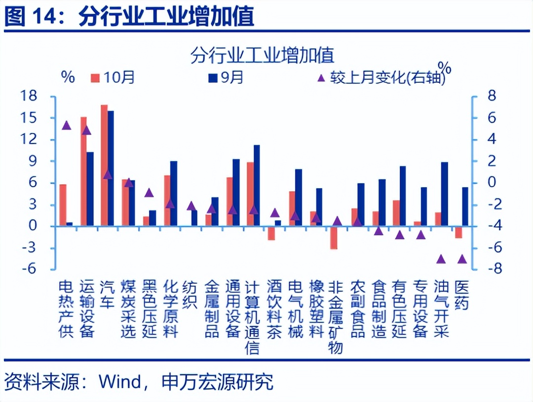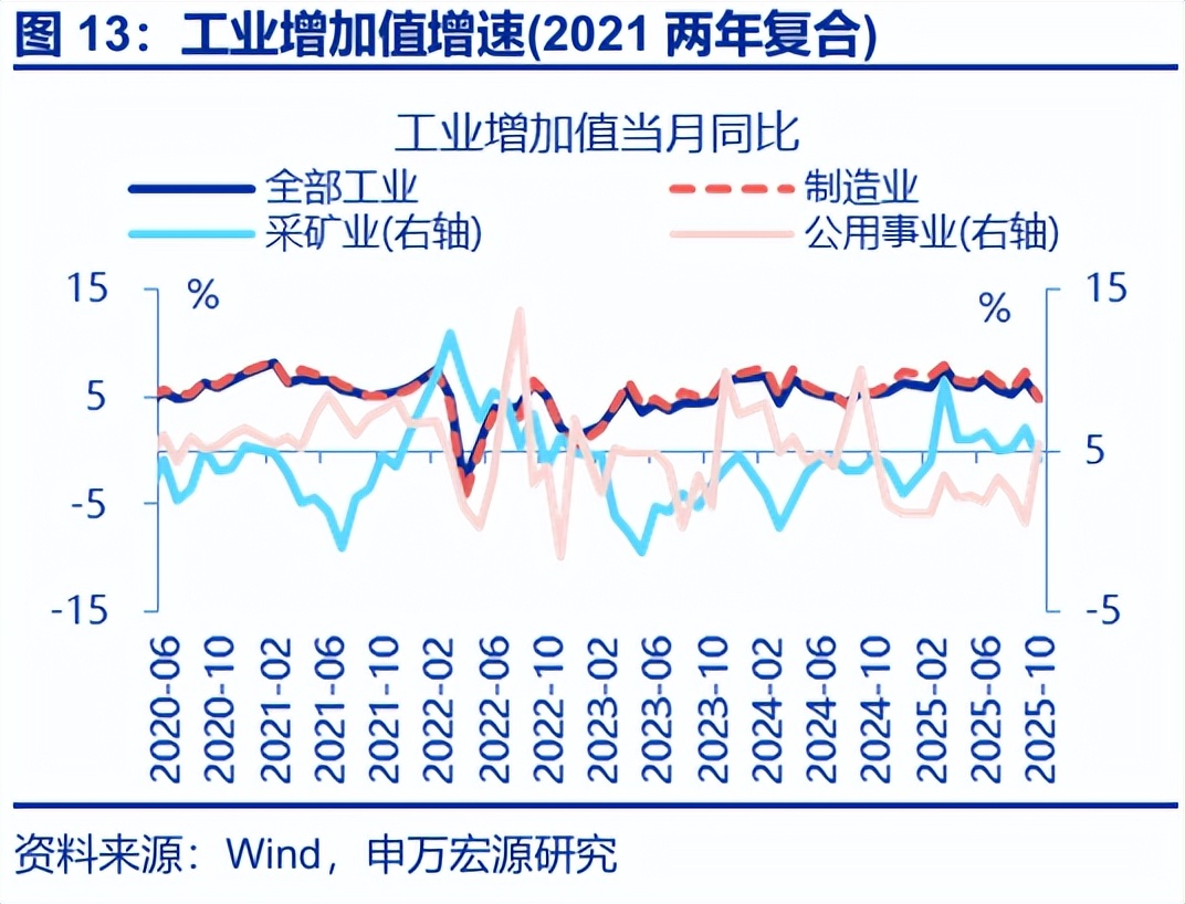 生产:工作日天数同比减少以及前期高库存约束生产,工业增加值增速明显回落,供给扰动也会拖累固定投资。10月工业增加值增速回落1.6pct至4.9%。10月工作日天数仅18天、同比较前月减少3天,对供给拖累较大;9月制造业存在 “补库存抢生产”现象,10月明显退坡;拆分结构看,下游前期“抢生产”现象明显,10月均明显退坡,数据上9月生产走强的食品(-4.4pct至2.1%)、农副食品(-3.5pct至2.5%)、酒和饮料(-2.7pct至-1.9%)等行业10月生产增速回落明显,仅汽车(+0.8pct至16.8%)受购置税调整影响有所走强。上游生产普遍回落,如有色压延(-4.7pct至3.7%)、非金属矿物(-3.4pct至-3.2%)、橡胶塑料业(-3.2pct至2.1%)生产在基建地产投资下行的拖累下有较大回落。中游如专用设备(-4.7pct至0.7%)、电气机械业(-3pct至4.9%)生产也有下行,或体现反内卷的影响。