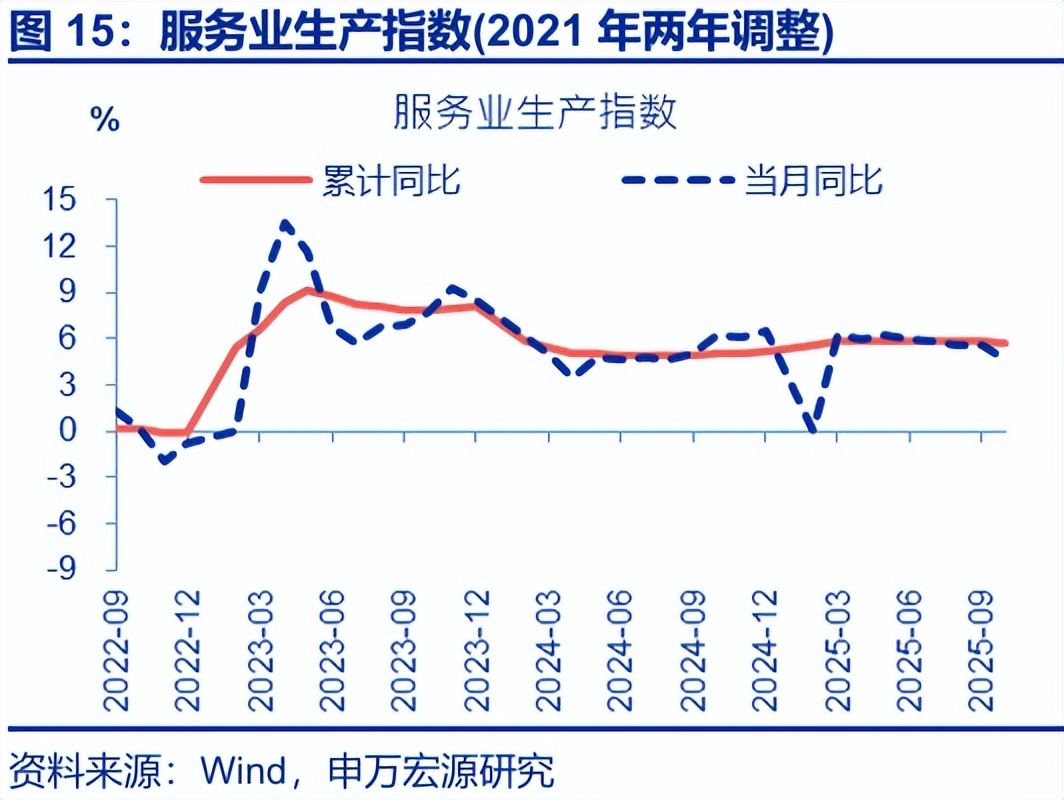 社零:电商促销前置但“以旧换新”商品消费退坡;工作日同比减少支撑服务消费韧性。10月社零偏弱主要源于商品零售拖累。虽然电商促销前置拉动通讯器材、纺织服装零售改善,但 “以旧换新”商品如汽车(-8.2pct至-6.6%)、家电(-17.9pct至-14.6%)降幅较明显。服务消费表现稳健,餐饮收入(+2.9pct至3.8%)、服务业零售额均改善。