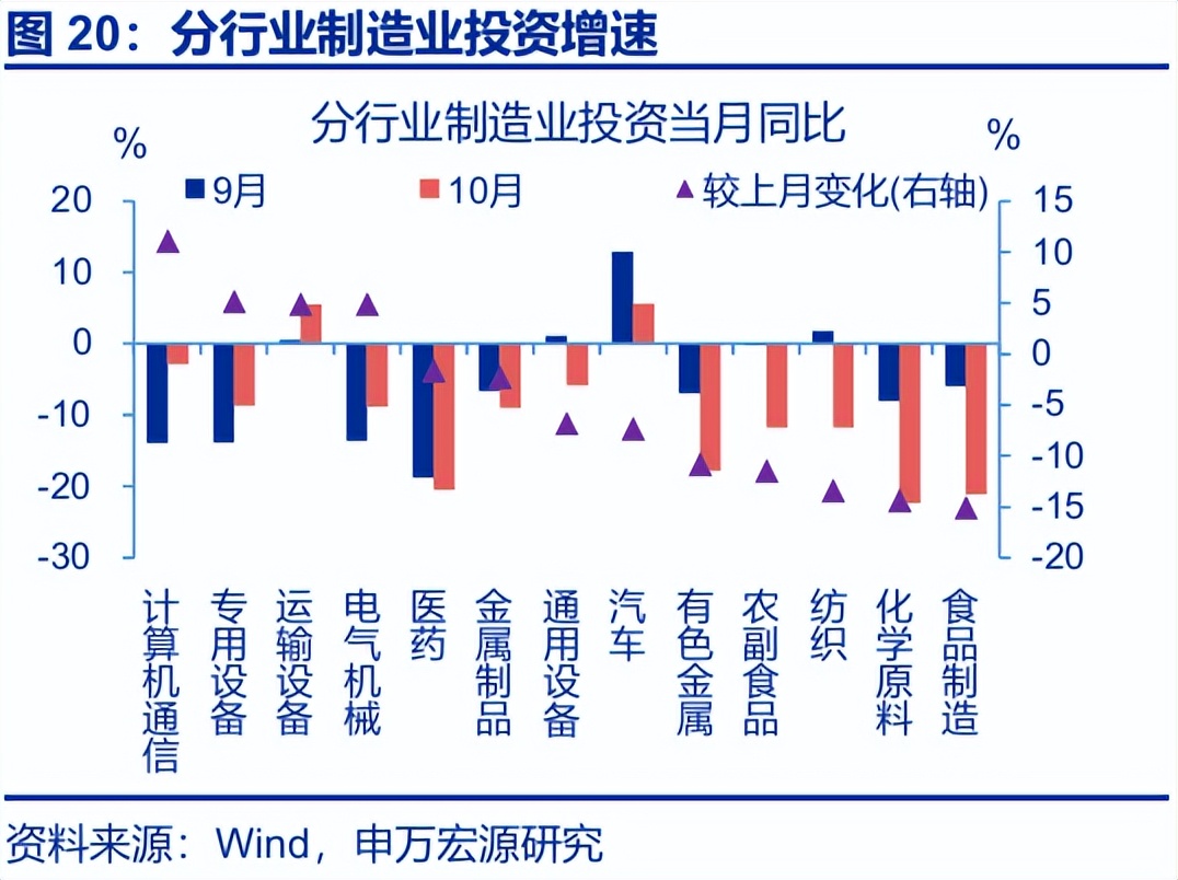 制造业投资有所回落,食品、化学原料等劳动密集型行业投资降幅较大。10月,制造业投资累计同比较上月下行1.3个百分点至2.7%;当月同比较上月回落3.7个百分点至-6%。分行业看,食品制造、化学原料、纺织等行业投资增速有较大回落,分别较前月下行15.1、14.4、13.4个百分点至-21.1%、-22.4%、-11.7%;计算机通信、专用设备业投资增速则有回升,分别较前月上行11、5.1个百分点至-2.8%、-8.6%。
