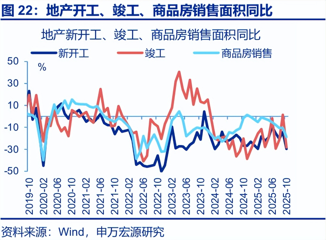 地产投资延续走弱,商品房销售面积亦在下滑。10月,房地产开发投资延续回落,累计同比较前月下行0.8pct至-14.7%,当月同比较前月下滑1.6pct至-22.9%。分不同阶段看,新开工、竣工均有回落,当月同比分别较前月回落15.1、29.7个百分点至-29.5%、-28.2%,商品房销售面积也有下行、当月同比回落8.2个百分点至-18.8%。