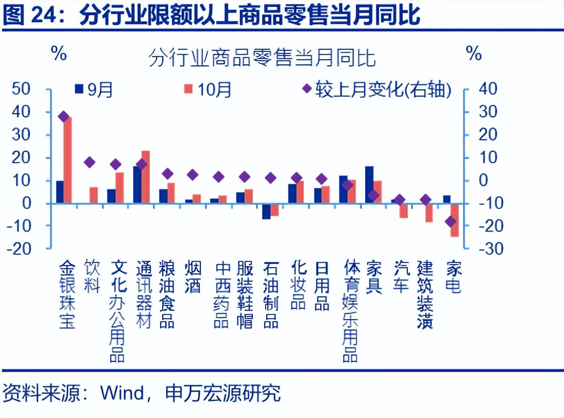 消费:社零增速小幅下行,结构上商品零售降幅较大。10月,社零当月同比较上月回落0.1pct至2.9%。其中,商品零售当月同比较上月回落0.5pct至2.8%,餐饮收入当月同比较上月回升2.9pct至3.8%。分品类看,家电、建筑装潢降幅较大,当月同比分别回落17.9、8.2pct至-14.6%、-8.3%;而金银珠宝有所改善,当月同比上行27.9pct至37.6%。