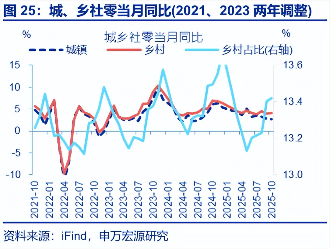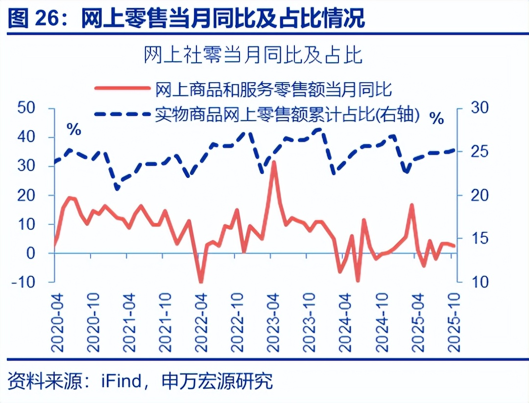 社零:电商促销前置但“以旧换新”商品消费退坡;工作日同比减少支撑服务消费韧性。10月,社会消费品零售总额同比增长2.9%,较上月小幅回落0.1个百分点,主要源于商品零售拖累。其中限额以上商品零售(-1.3pct至1.4%)下滑幅度较大,其中“以旧换新”典型商品如汽车(-8.2pct至-6.6%)、家电(-17.9pct至-14.6%)降幅较明显。不过,电商促销前置部分对冲上述影响,如通讯器材(+7pct至23.2%)、纺织服装(+1.6pct至6.3%)均有改善,也带动必需品消费如粮油食品(+2.8pct至9.1%)、中西药品(+1.7pct至3.6%)温和修复。服务消费表现稳健,10月工作日天数仅18天、同比较前月减少3天,考虑到国庆节后一周休假情况也居多,进一步放大了对服务消费的支撑,10月服务零售额累计同比较上月上行0.1个百分点至5.3%,餐饮收入当月同比较上个月改善2.9个百分点至3.8%。