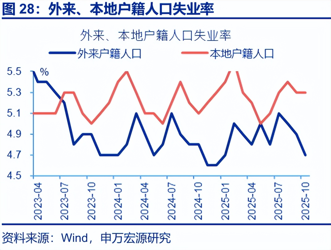 就业:城镇调查失业率小幅下行,本地、外来户籍人口就业压力均有所好转。10月,城镇调查失业率较前月回落0.1pct至5.1%,与过往5年均值持平。其中,本地户籍(5.3%)人口失业率持平前月,外来户籍(4.7%)较前月回落0.2pct。