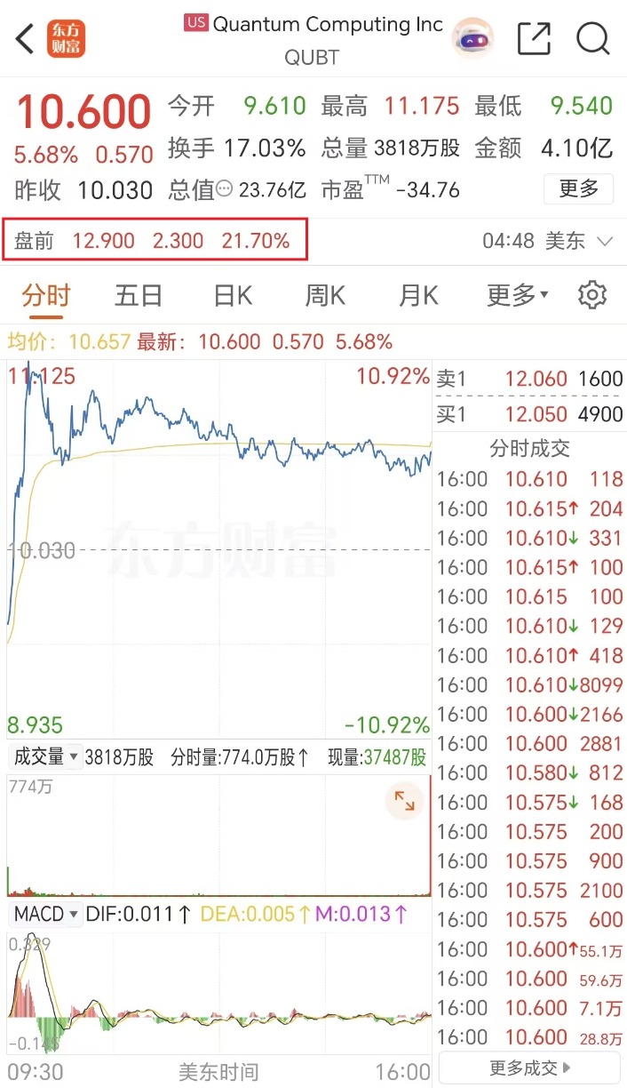 当地时间周一(11月17日)美股量子计算概念股盘前大涨,QUBT绩后涨超21%,QBTS涨超4%,IONQ、RGTI涨近3%。