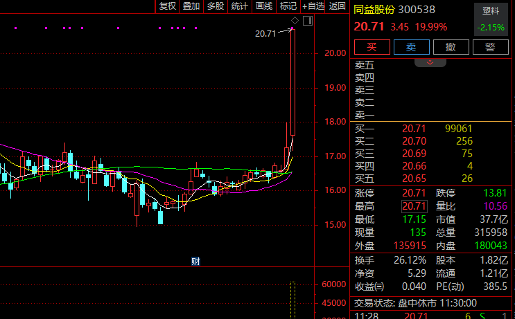 11月18日上午,同益股份(300538)高开后大幅拉升逾8%,随后震荡整理。10点11分左右,该股直线飙升,短短4分钟左右从上涨约4%飙升至“20cm”涨停。