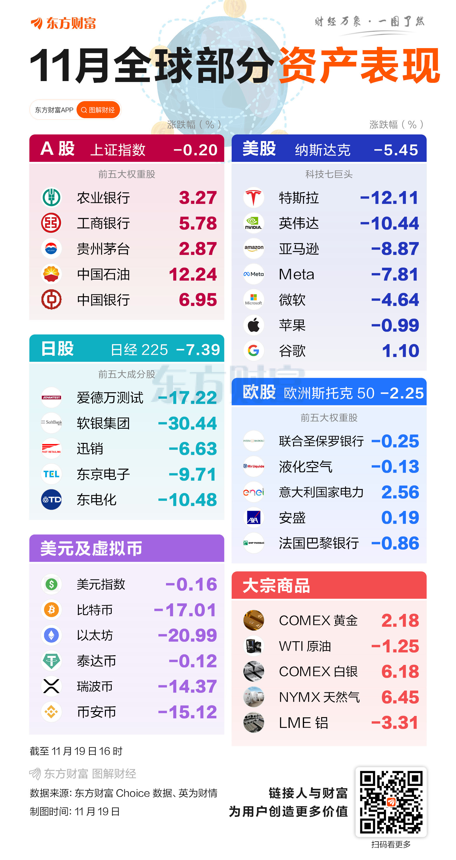 进入11月以后,全球金融市场动荡,美股、日股、欧股、虚拟币、A股等全球主要资产均出现调整。截至北京时间11月19日16时,纳指当月跌超5%,日经225大跌7.39%,欧洲斯托克50下跌2.25%,沪指及恒指微跌约0.2%,比特币当月暴跌17%。