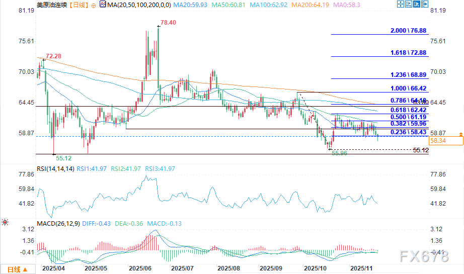 北京时间21:43,WTI原油期货报58.31美元/桶,跌幅1.17%。汇通财经APP讯——周五(11月21日)欧洲时段,看空情绪主导市场,注意力转向下一主要下行目标:10月20日形成的55.96美元主要底部,以及5月5日的55.30美元主要底部。