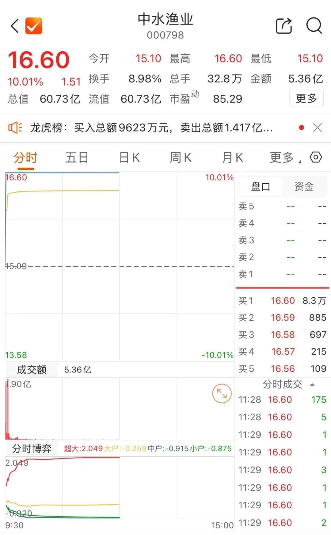 11月24日,水产概念震荡反弹,中水渔业开盘1分钟直线涨停,至此,该股已连续7个交易日涨停,7天累计涨幅达94.84%。