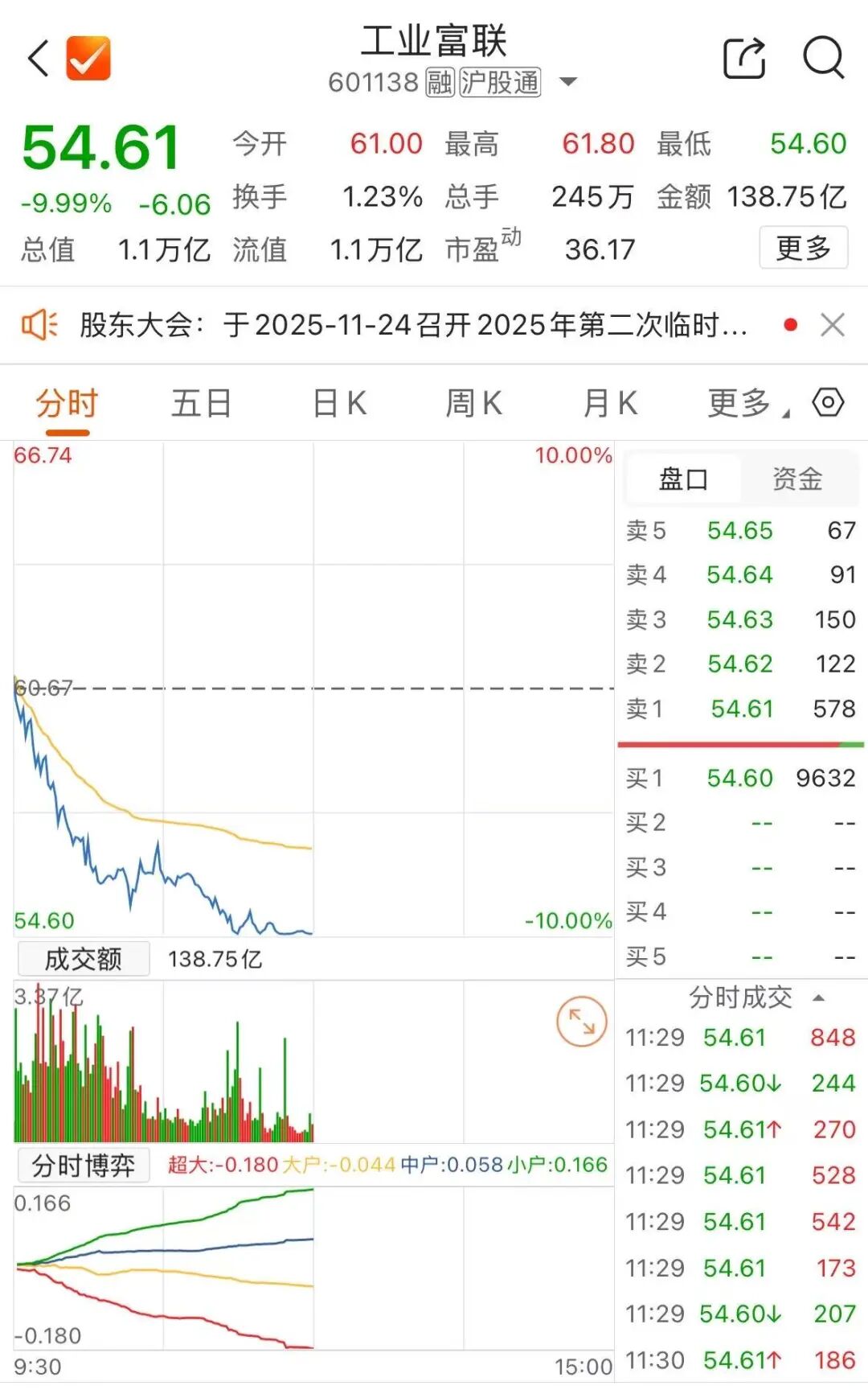 11月24日,算力硬件股盘中震荡回落,工业富联触及跌停,截至午间休市,股价逼近跌停,成交额达139亿元,创出2个月以来新低,方正科技、剑桥科技、仕佳光子、中际旭创、天孚通信、新易盛等跟跌。