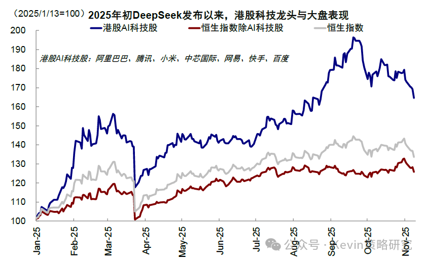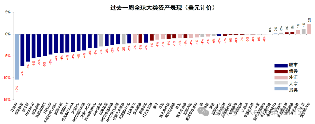 近期,AI泡沫卷土重来、且似有愈演愈烈之势,这也成为引发美股、A股和港股三地市场AI相关成长风格、甚至整体风险资产大跌的罪魁祸首之一。过去一周,AI泡沫的担忧导致全球科技股下挫,美元计价下,恒生科技(-7%)、创业板(-6%)和“美股七姐妹”(-6%)领跌。