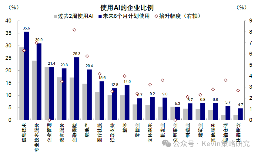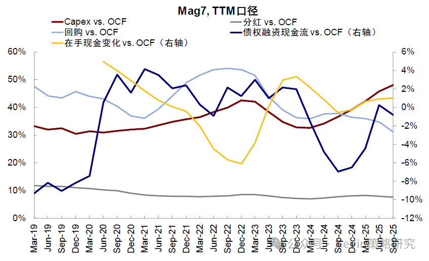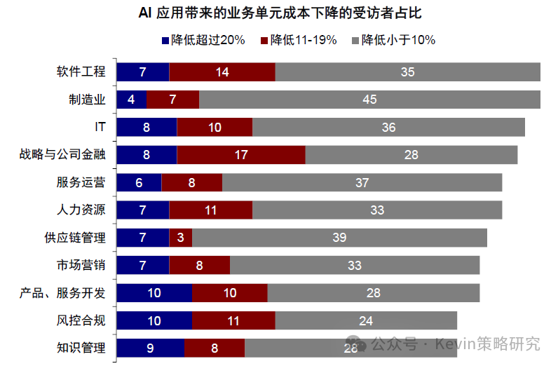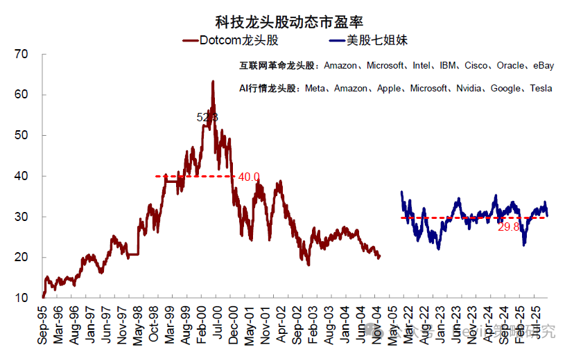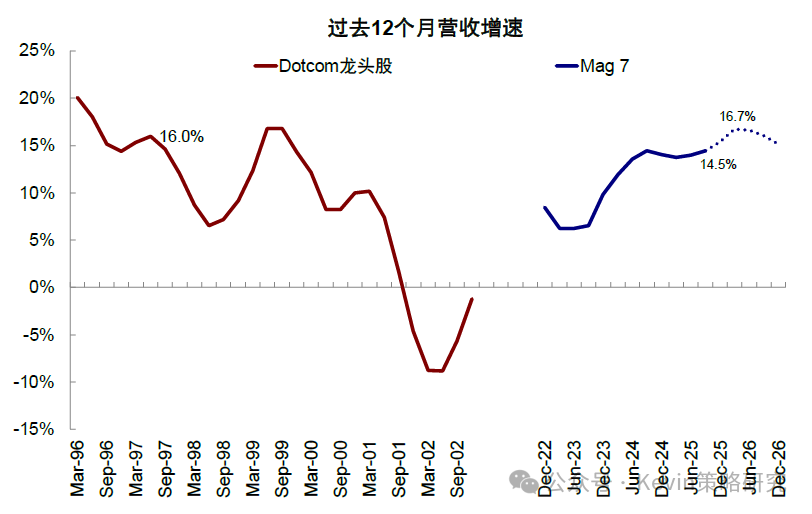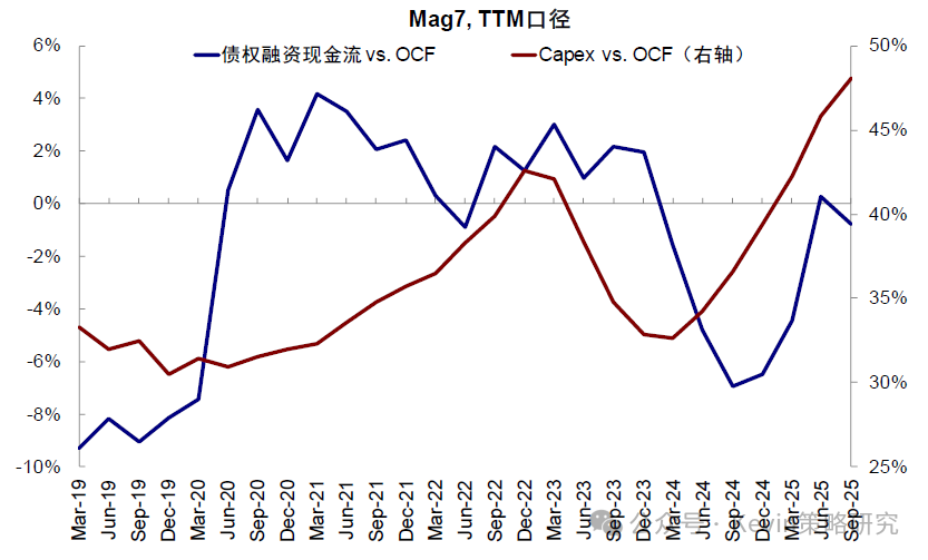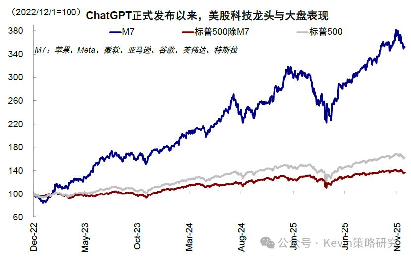 图表:过去一周全球大类资产表现中,比特币、恒生科技、创业板以及“美股七姐妹”领跌 资料来源:Bloomberg,FactSet,中金公司研究部 虽然与此同时,美国政府关门、回购市场流动性紧张、美联储降息预期降温,国内数据转弱也都来“凑热闹”,压制了风险偏好,但AI泡沫担忧才是最核心的问题,毕竟这是当下中美三地市场最主要的景气方向之一。例如,从2022年底ChatGPT发布以来,美股“七姐妹”最高上涨283%,大幅跑赢同期标普500指数扣除M7后的69%;中国市场也是如此,2025年初DeepSeek发布以来,中国科技“十巨头”最高上涨81%,大幅跑赢恒指扣除“十巨头”后的19%,年化表现甚至一度超过M7。可见,不论是市场表现、还是信用周期,AI趋势都牵一发而动全身,一荣俱荣、一损俱损(《2026年展望:跟随信用扩张的方向》)。 图表:美股“七姐妹”最高上涨283%,大幅跑赢同期标普500指数扣除M7后的69% 资料来源:Bloomberg,FactSet,中金公司研究部 图表:2025年初以来,中国科技“十巨头”最高上涨81%,跑赢恒指扣除“十巨头”后的19% 资料来源:Wind,FactSet,中金公司研究部 如何正确地讨论泡沫?不在于否认泡沫、而在于确认阶段;区分二级市场和产业本身 在具体讨论AI是否是泡沫之前,我们认为需要首先厘清几个问题,有助于接下来的讨论更加有的放矢。 ► 第一,泡沫是一个中性词。泡沫并非坏事,一定意义上,恰是投资冲动推动了产业发展。因此,没必要先入为主地对泡沫有负面印象。 ► 第二,如果任何一个产业趋势最终以泡沫收场,也不应该在泡沫形成阶段过早离场。以1998年10月到2000年3月泡沫形成期为例,盈利大幅下滑但估值快速扩张,带动纳斯达克指数在15个月内累计上涨256%,年化收益达到144%,相当于1995~1998年快速上涨期的4.5倍(年化收益率32%)。因此,讨论的关键不在于否认泡沫,而在于确认现在处于哪个阶段。 图表:市场自1995年开始逐渐开始进入“非理性繁荣”阶段,并且在1998年之后进一步加剧 资料来源:Bloomberg,中金公司研究部 ► 第三,泡沫的讨论是一个涉及到对未来预期的动态过程,但这也恰恰是市场的分歧点。例如,当前市场预计OpenAI的IPO估值是1万亿美元[1],相比其当前年化200亿美元的收入[2],P/S高达50倍。但如果明年其收入翻番的话,P/S估值会迅速降至25倍,就“合理”得多。 ► 第四,要区分资本市场泡沫和产业本身的泡沫。二级市场的泡沫和产业自身的泡沫既有关联但也需适度区分,如果更多是集中在二级市场上,那股价的调整和消化会带来更好的配置机会,例如年初因为DeepSeek异军突起导致“美股七姐妹”大幅回调近20%,但随着估值回调和担忧的证伪,也迎来再配置机会。相反,如果产业趋势已经被证伪,即便估值泡沫被消化,也不值得增加仓位。 图表:DeepSeek异军突起导致“美股七姐妹”大幅回调近20% 资料来源:FactSet,中金公司研究部 如何有效地判断泡沫?加速投资不是泡沫,远超需求和能力才是;持续上涨、高估值和龙头集中也不等同于泡沫,超过价值才是 所谓泡沫,从一、二级市场角度,主要看价格偏离价值的程度;从产业本身角度,则要看投资是否已经超过了需求和能力,这也是我们在本文中讨论AI是否是泡沫的主要框架和依据。具体来看, 图表:从一、二级市场角度,主要看价格偏离价值的程度;从产业本身角度,则要看投资是否已经超过了需求和能力 资料来源:中金公司研究部 ► 对产业自身来说,核心在于投资与需求和能力是否匹配。1)AI需求怎么看?AI创造的需求可以分为外延颠覆式创新和内生对现有系统降本增效两个层面,虽然AI技术应用落地所带来的外延需求,可能存在时滞,但内生部分的降本增效已经开始显现成果;2)投资与需求是否匹配?可以通过观察当前的投资强度(以capex vs. sales),并对比2000年互联网泡沫的力度作对照;3)投资与能力是否匹配?可以通过投资资金的来源(经营性现金流还是举债融资)、以及杠杆的水平高低来衡量。因此,加速投资不等于泡沫,投入远超需求和远超过自身承担能力才是泡沫。 ► 对权益市场来说,持续上涨、高估值或龙头集中都不等同于泡沫,只有当定价脱离基本面支撑的才是。对比互联网泡沫时期,本轮一、二级市场更加理性,一级市场资金更聚焦优质龙头企业,二级市场中“美股七姐妹”估值也远低于互联网时期的“泡沫”水平,更何况盈利韧性也更强。此外,龙头集中度上升也并非等同于泡沫,而是在技术加速演进背景下出现的正常产业结构现象。 Q1、AI需求有多大?内生降本已经兑现,外延需求仍待突破;对经济贡献远大于互联网泡沫时期,接近1996~1997年 AI需求的大小和未来空间是讨论泡沫问题的第一性问题,可以从两个角度讨论:1)降本增效和提升生产率的内生需求,这一点更快,且已经兑现;2)来自新应用场景的外延需求,这一点尚未有突破性进展,也是M7自2022年底始终面临35倍的估值顶无法有效突破、且泡沫声音时不时就卷土重来的根本原因。 ► 内生降本增效:AI应用已经开始带来明显的成本节省。麦肯锡调查显示,受访者表示当前使用AI可减少9~11%的成本。如果仅粗略的从标普500的维度来看,SG&A总规模约3万亿美元,约等于一年可以节省3000亿美元的成本,相当于Open AI 200亿美元年化收入[3]的15倍。劳动生产率提升速度更快。自2023年以来,非农商业部门的劳动生产率已经抬升5.6%,提升速度快于1995~2000年互联网革命时期,抬升幅度接近1997年底水平。