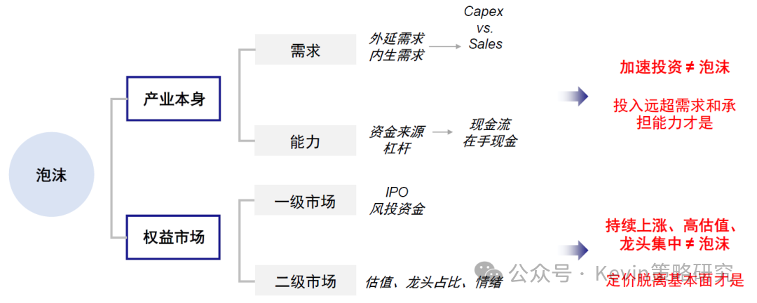 如何有效地判断泡沫?所谓泡沫,从一二级市场,主要看价格偏离价值程度;从产业本身,要看投资是否已超过了需求(内生与外延)和能力(资金来源与杠杆高低)。加速投资不是泡沫,远超需求和能力才是;持续上涨、高估值和龙头集中也不等同于泡沫,超过价值才是。