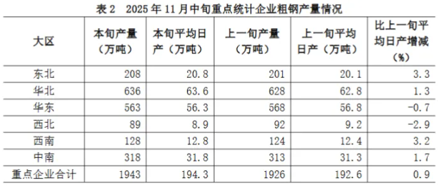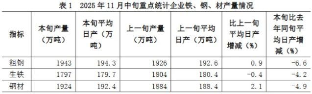 2025年11月中旬,重点统计钢铁企业共生产粗钢1943万吨,平均日产194.3万吨,日产环比增长0.9%;生铁1797万吨,平均日产179.7万吨,日产环比下降0.4%;钢材1924万吨,平均日产192.4万吨,日产环比增长2.1%(见表1)。