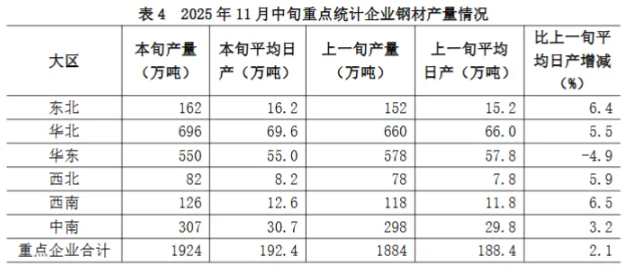11月中旬六大地区中,除华东地区重点统计企业钢材日产量较上一旬有所下降外,其它地区均有不同程度增长(详见表4),具体为: