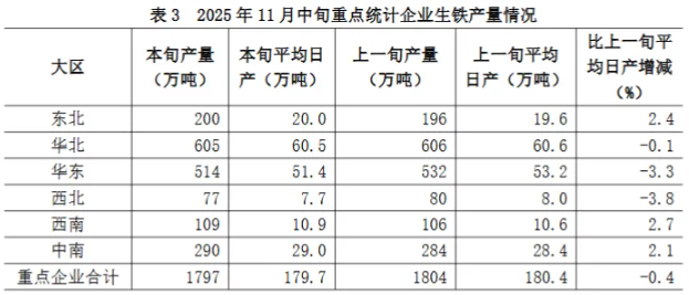 11月中旬六大地区中,除东北、西南、中南地区重点统计企业生铁日产量较上一旬有所增长外,其它地区均有不同程度下降(详见表3),具体为: