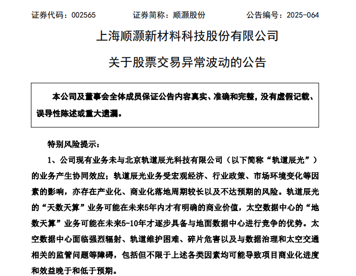 回溯原委,近期“商业航天概念股”因商业航天相关政策及有关事件的影响下,顺灏股份涨幅明显;部分媒体报道了太空算力领域同业企业的项目进展最新情况。2025年6月,顺灏股份以1.1亿元投资轨道辰光,持股比例为19.30%。