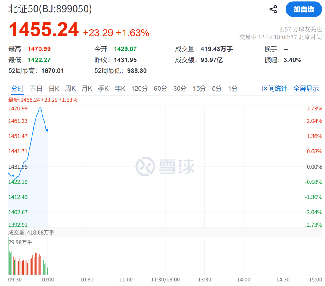 12月16日,上午市场震荡走低,截至发稿,三大指数均跌超1%,超4500只个股下跌;北证50指数逆市飘红。