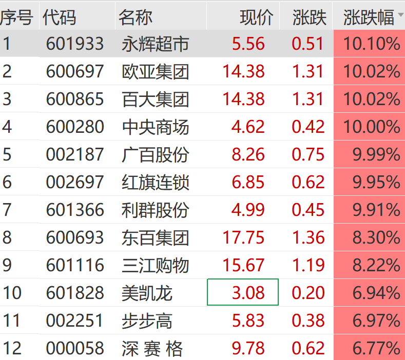 商贸零售板块持续火热,百大集团4连板,欧亚集团、中央商场、红旗连锁等纷纷涨停,三江购物、东百集团等跟涨。