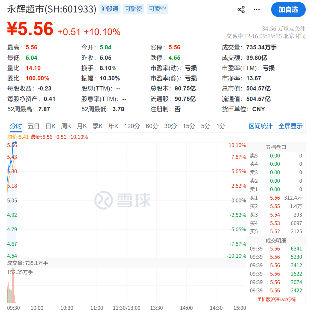 永辉超市延续昨日火热,开盘不久后直线拉涨停,报5.56元/股。