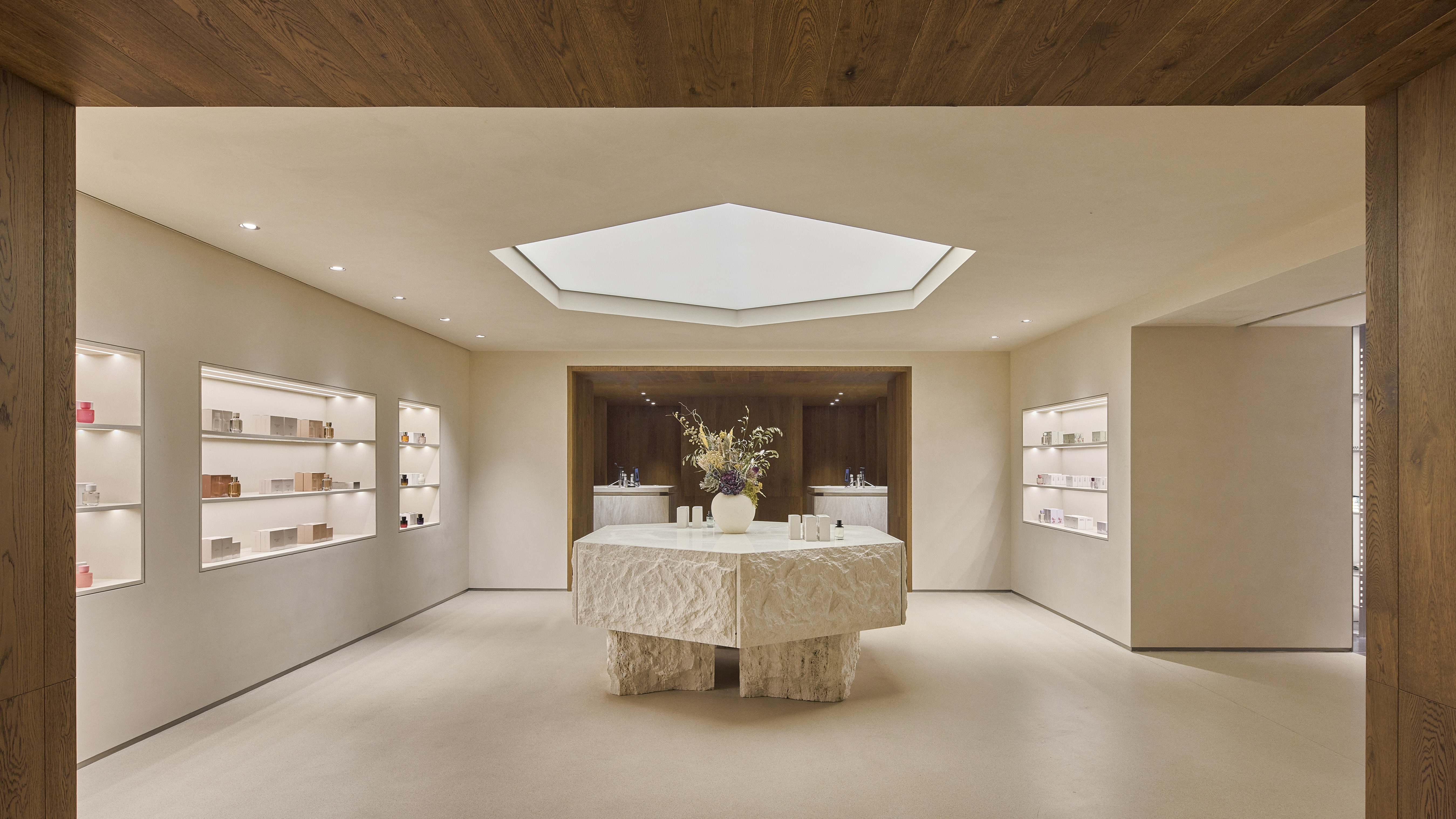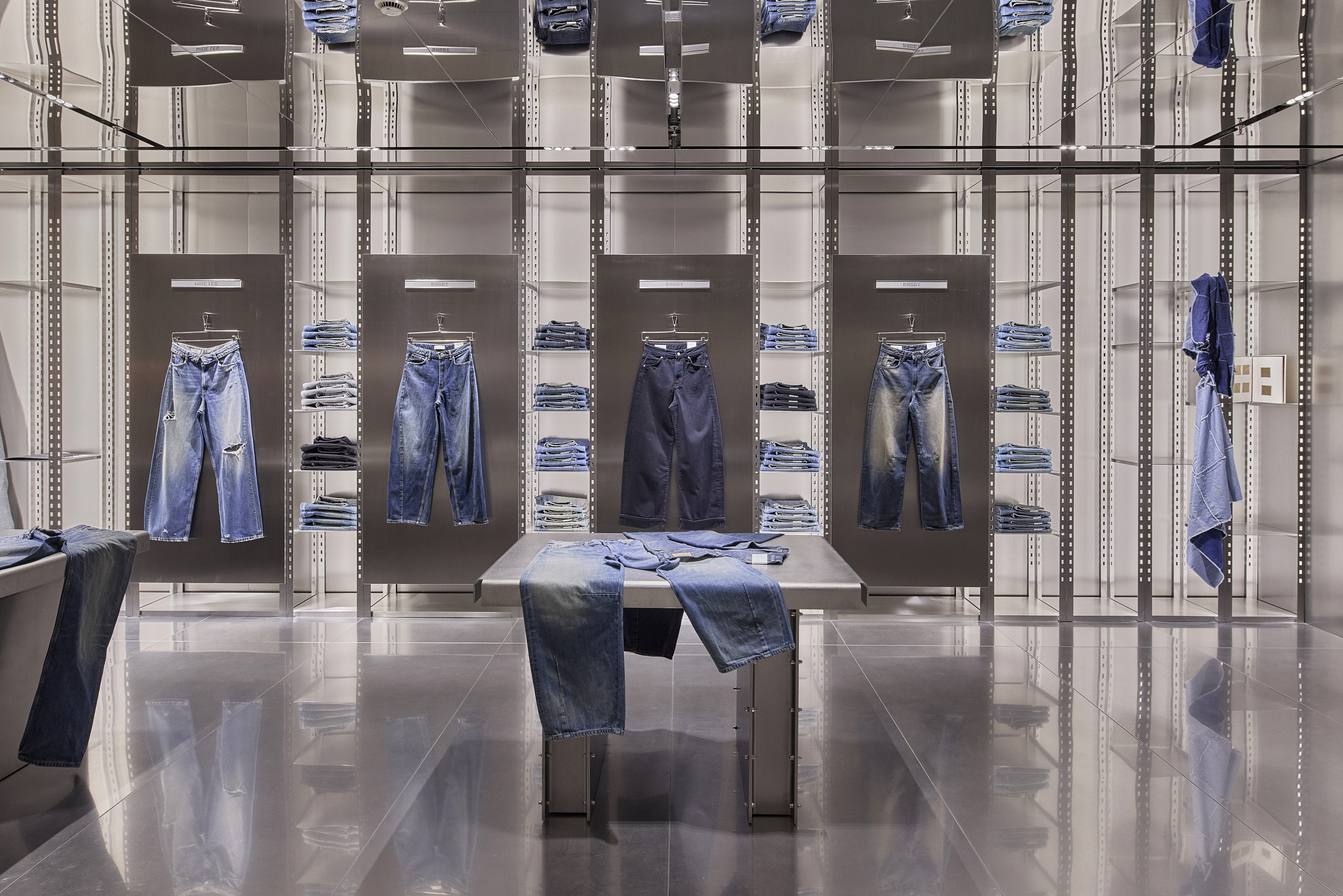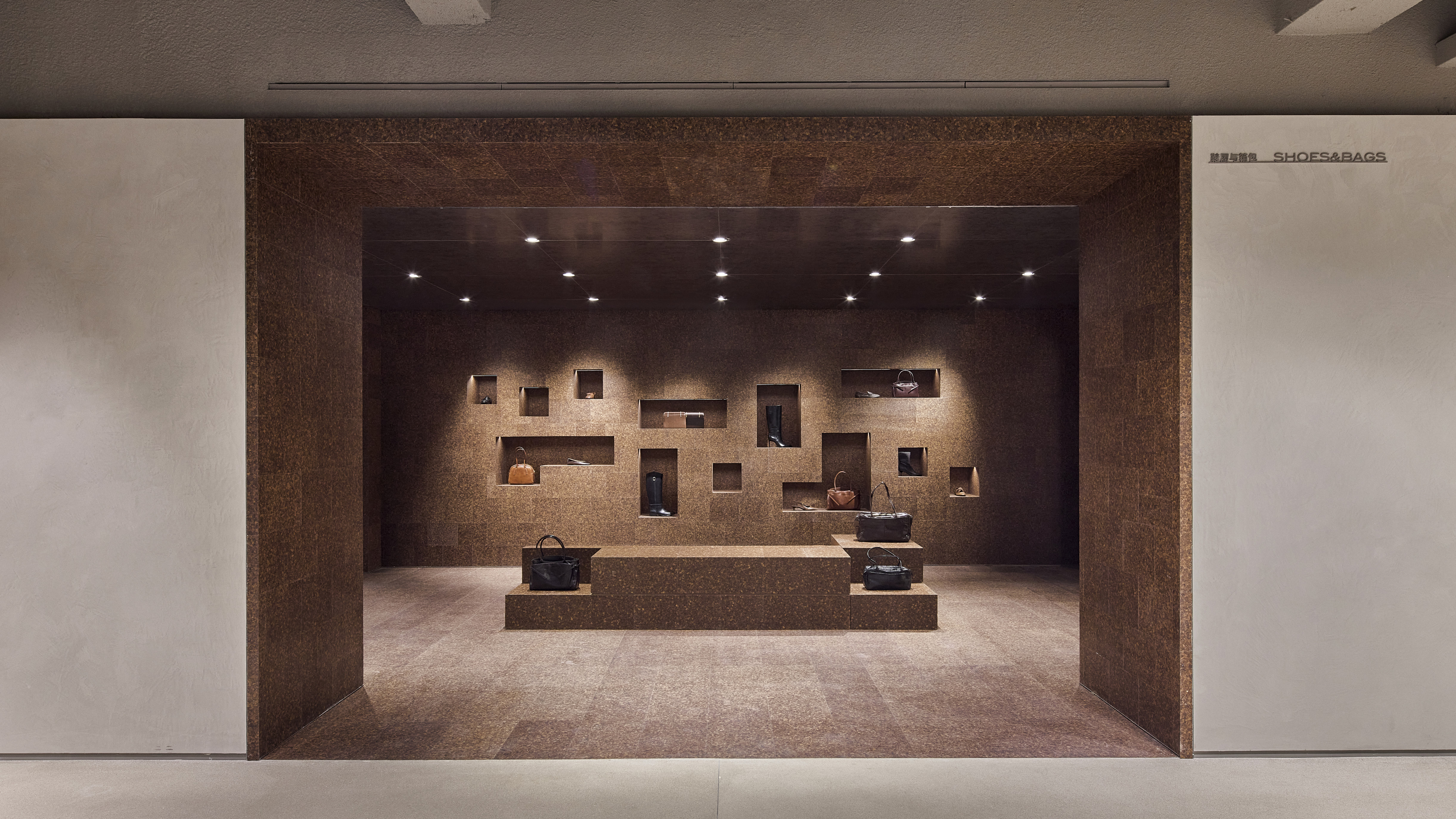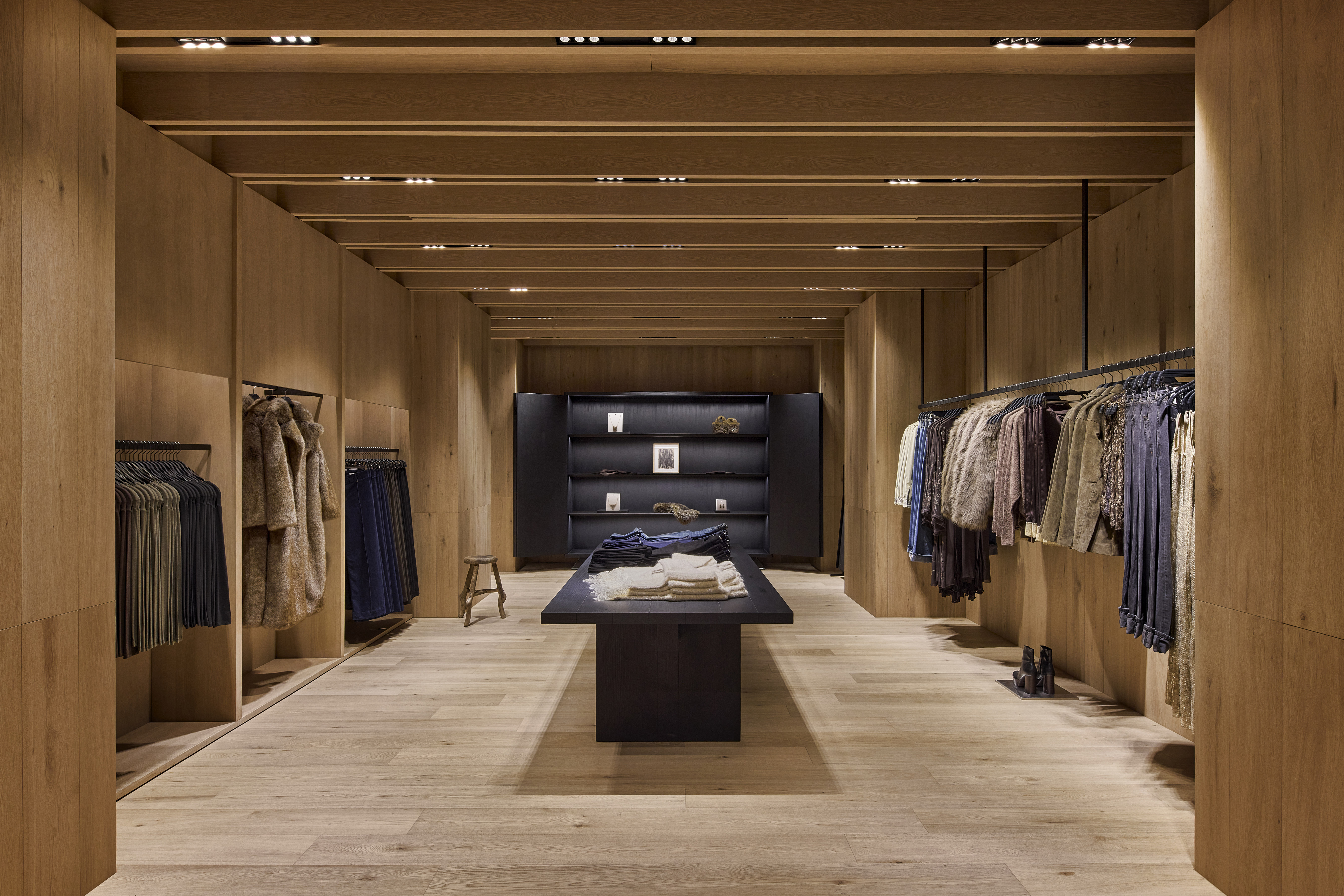 步入店内空间,感官细节处处可见:工业质感的墙面,融入木材、天然织物与多样的肌理元素、软木元素作为自然材质点缀其间,同时中性及大地色系构成主色调,配合层次丰富的灯光效果。与此形成对比的是年轻女装系列专属区域——不锈钢元素、流线型轮廓与特色家具共同勾勒出该系列的独特风格。男装系列则呈现出更为精致的场景,深色基调辅以不锈钢细节与木纹饰面,营造沉稳氛围。试衣间区域从二十世纪初的设计中汲取灵感,呼应黄浦区历史建筑特有的几何线条与大胆传承的美学风格。墙面精选的系列摄影作品进一步完整了空间视觉叙事,与服装系列相得益彰。