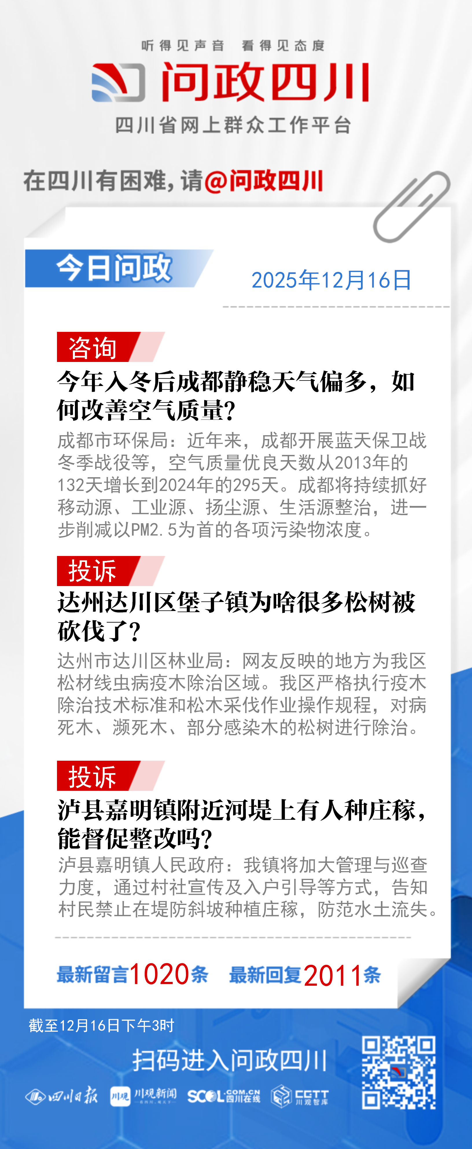 问政四川网友提问:近年来,成都市空气质量改善成效有目共睹,但今年入冬以来,成都雨水明显偏少、静稳天气偏多,叠加北方输入性沙尘影响,近期空气质量不佳。希望能进一步优化空气质量,为民众营造健康放心的生活环境。