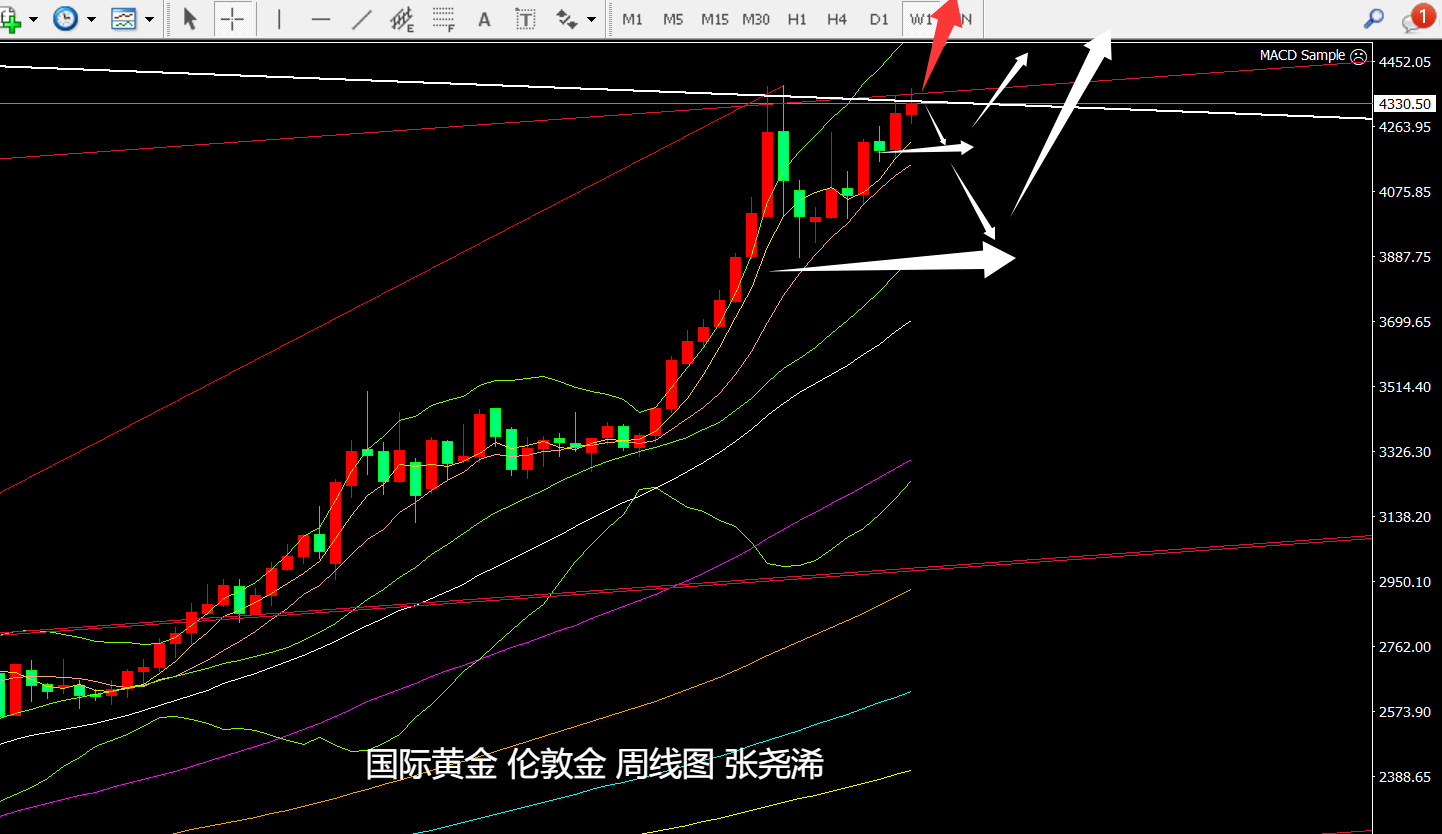 周线级别,金价目前反弹受到之前历史高点触及的趋势线压力附近,动力有所减弱,未能突破增强多头,附图指标信号也有所偏弱,有回撤至5-10周均线附近4200美元关口附近的风险,以及更低位置的中轨支撑附近的预期,跟根据目前牛市攀升的节点来看,如有回撤触及,也是再次入场看涨的机会,反正如突破阻力持稳,则可顺势跟进看涨上行。